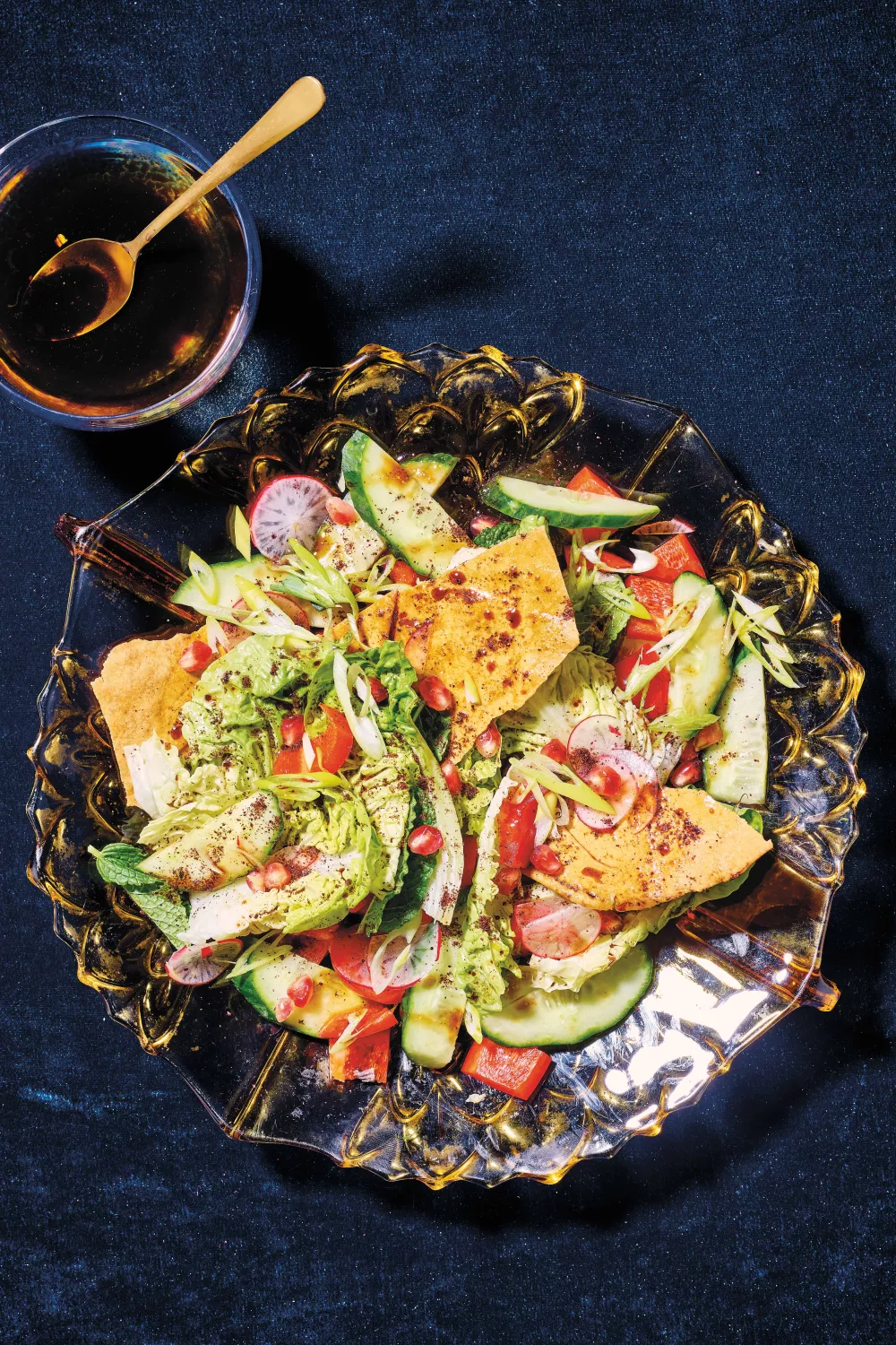 Fattoush is een Levantijnse, knapperige salade met romaine, komkommer, paprika en kerstomaten, aangevuld met pittige radijs en verfrissende munt en afgewerkt met granaatappelpitten en krokant Libanees brood. De friszure granaatappeldressing met sumak en citroen geeft een fruitige, kruidige toets. Ideaal als zomers bijgerecht, lichte lunch of mezze.