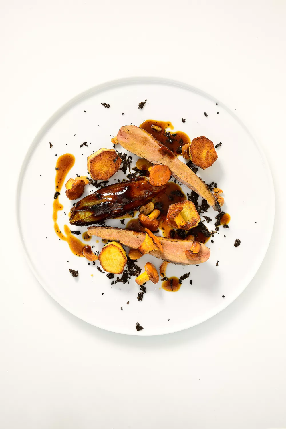 Een feestelijk klassiek hoofdgerecht met malse fazantenborst, aardse trompet de la mort, boterig witloof en de intense geur van zwarte truffel. Door het vlees kort aan te schroeien, rustig na te garen in de oven en de jus met cognac en bruine fond in te koken ontstaat een rijke, geconcentreerde saus. Afgewerkt met krokante hazelnoten en goudbruine aardappelschijfjes is dit wildgerecht ideaal voor herfst en winterdiners.