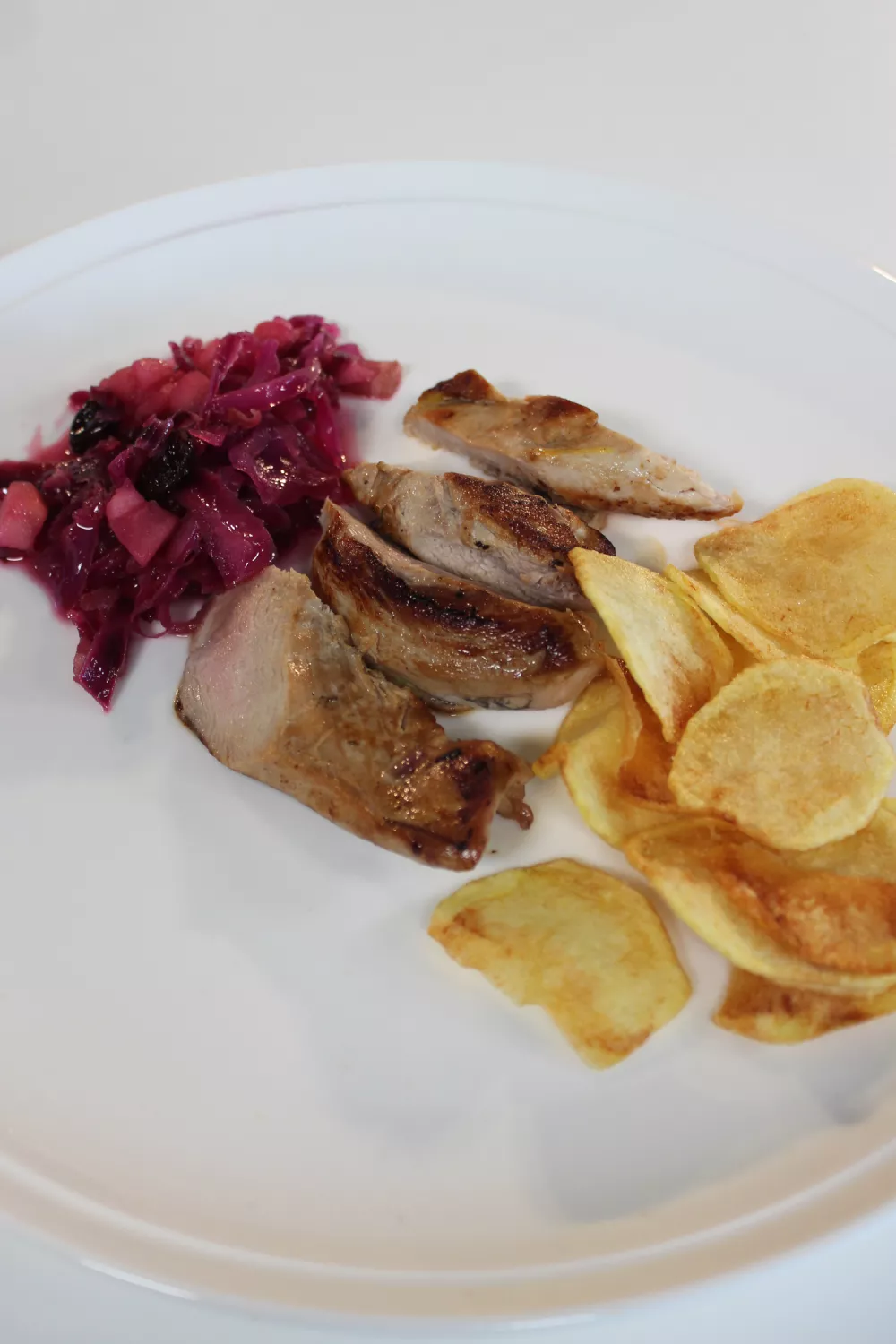 Snijd het vlees in plakjes en schik deze mooi op een bord. Schep een lepel rode kool en enkele krokant gefrituurde chips erbij.