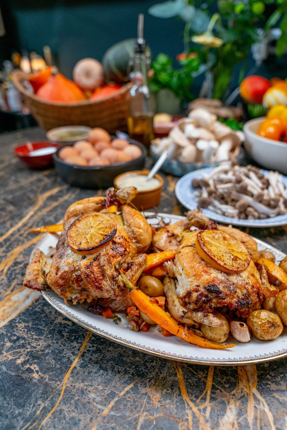 Dit feestelijke gevulde piepkuiken met goudbruine krielaardappelen brengt kruidige aroma’s van tijm en rozemarijn naar de tafel en is ideaal voor een winterse of gezellige zondagse maaltijd. De stevige stuffing van groene kool, wortel, rode kidneybonen en brood geeft hartige textuur en smaak, terwijl ovenroosteren de kip knapperig maakt. Een ingekookte fond met dragonazijn en room zorgt voor een romige, lichtzure saus die alles samenbrengt.