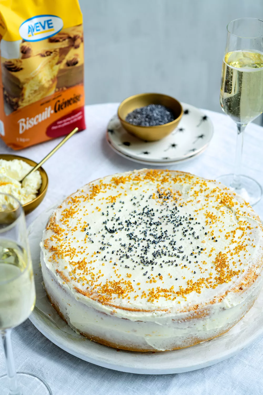 Deze feestelijke biscuit met schuimwijn en vlierbloesemsiroop is een luchtige taart die perfect past bij verjaardagen, brunches en zomerse of lentevieringen. Het recept combineert een fluweelzachte crème au beurre met een luchtig eierbeslag dat in de keukenrobot tien minuten wordt opgeklopt en in de oven goudbruin bakt. Werk af met feestelijke sprinkles of een scheut rode vruchtensiroop voor extra kleur en smaak.