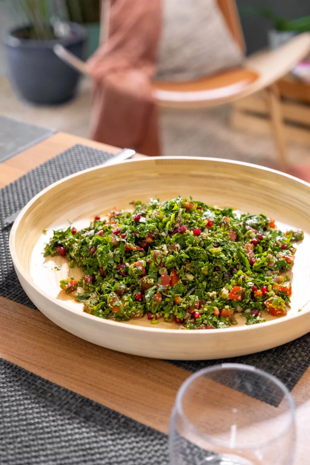 Deze feestelijke tabouleh combineert extra fijne bulgur met een berg peterselie, frisse citroen en munt voor een kruidige, frisse salade boordevol textuur. Zoetzure granaatappelpitjes, geurige rozenblaadjes en een scheutje granaatappelmelasse geven een Oosterse twist, terwijl 7 spice en olijfolie voor diepte zorgen. Snel te maken door de bulgur te wellen en alles fijn te hakken, ideaal als zomers bijgerecht of feestelijke borrelhap.