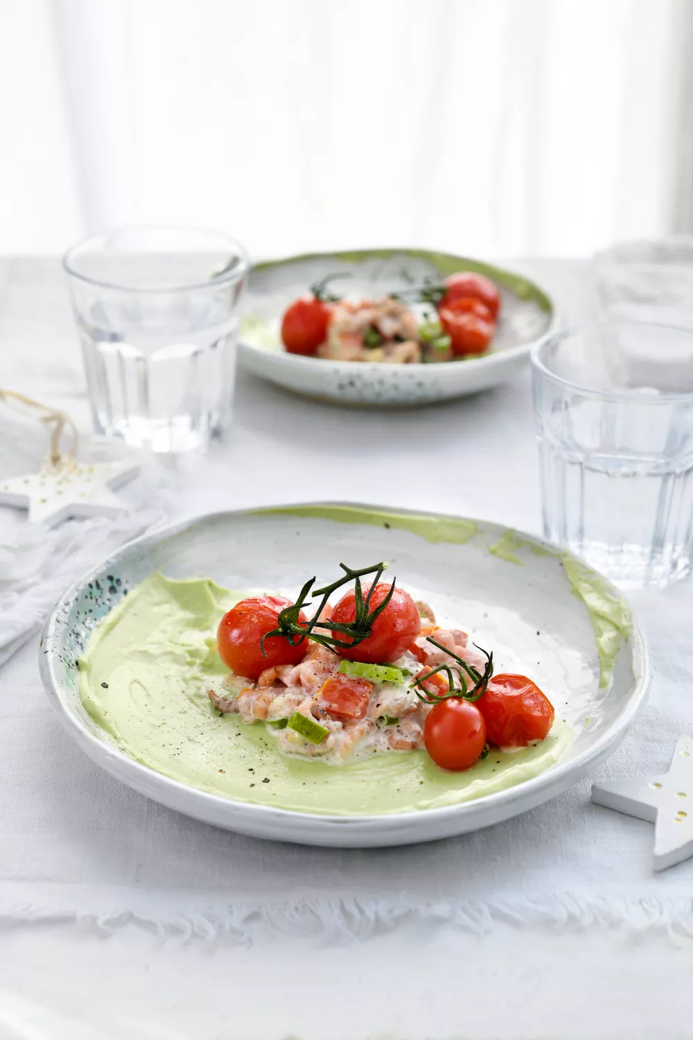 Neem verschillende bordjes. Bestrijk ze met een laagje van de avocadocrème en lepel er de grijze garnalen over. Werk af met wat kerstomaatjes uit de oven en fijngehakte bieslook.