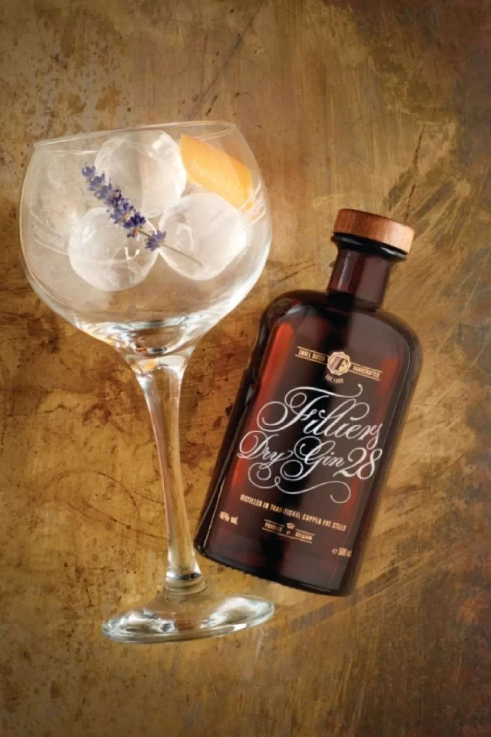 Filliers Dry Gin 28 kwam, net zoals Manuels Spring Gin op de markt in 2012. Het recept is verrassend genoeg niet nieuw. Firmin Filliers creëerde de gin in 1928 en de formule met 28 kruiden werd doorgegeven van vader op zoon. Van het oorspronkelijke proefdistillaat bestaat nog een halve fles. Daarmee ging meester-distilleerder Pedro Saez del Burgo aan de slag. Na twee jaar onderzoek stond het recept op punt. De hopbellen zijn de blikvanger onder de botanicals.