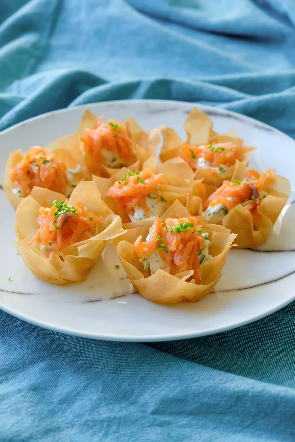 Krokante filodeegcups gevuld met romige kruidenkaas en fijne snippers gerookte zalm vormen een feestelijk en fris voorgerecht voor borrels, brunches en lichte lunches. Bestrijken met gesmolten boter en kort bakken in een muffinvorm geeft goudbruine, luchtige bakjes met een knapperige bite. Een snel en elegant hapje dat goed past bij lente en zomer of elk feestje waar verfijnde smaken gewenst zijn.