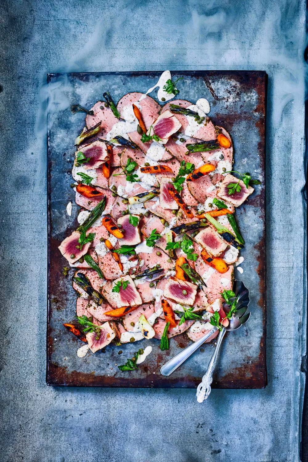 Snijd de tonijn in plakken van 1 cm dik en verdeel ze over het vlees. Schep de bosui en bospeen erop. Lepel de ansjovismayonaise over het geheel en werk af met de kappertjes en peterselieblaadjes. Breng op smaak met grof zeezout en een flinke draai van de pepermolen.