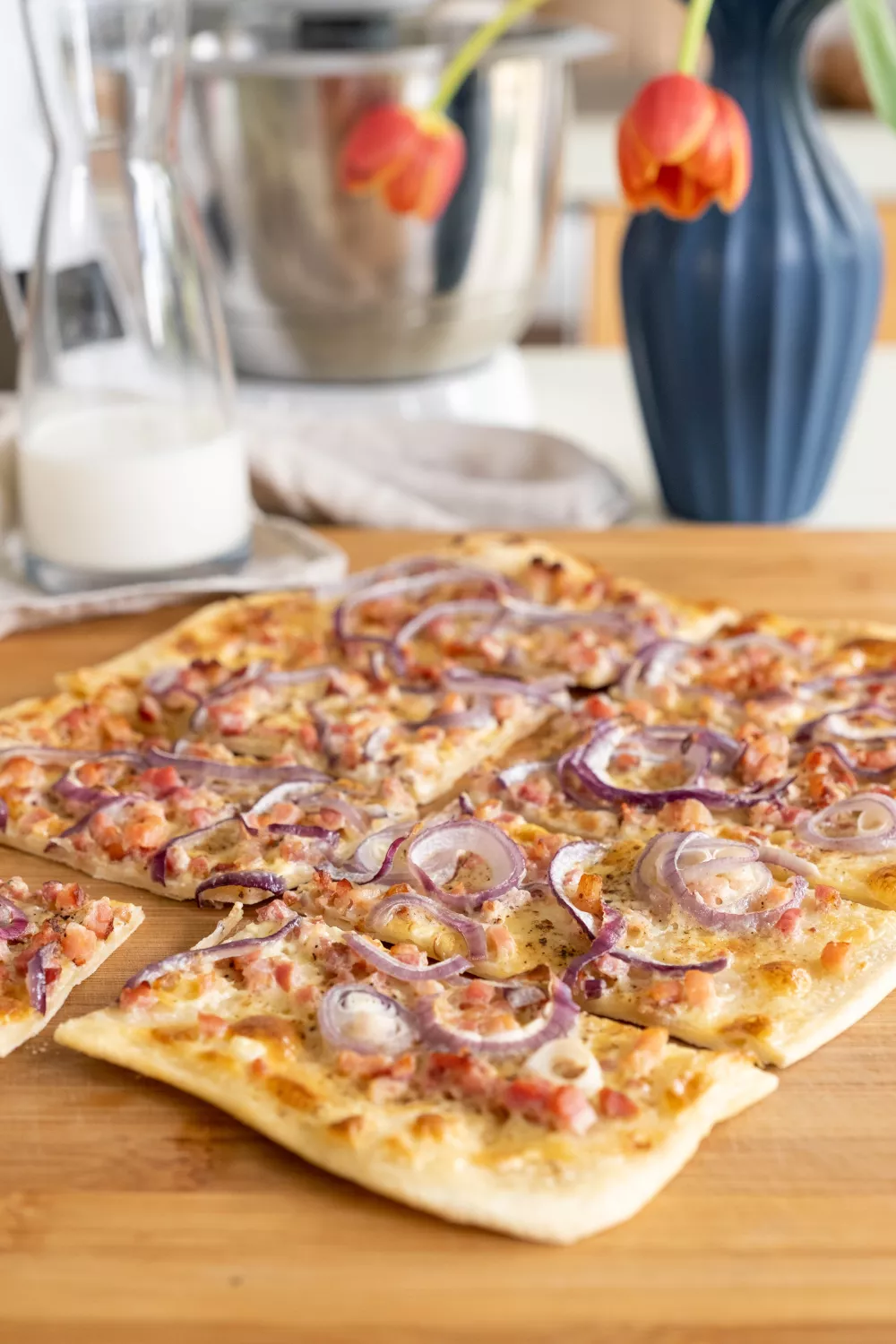 Bak de flammkuchen 16-18 minuten of tot de randjes mooi goudbruin zien.