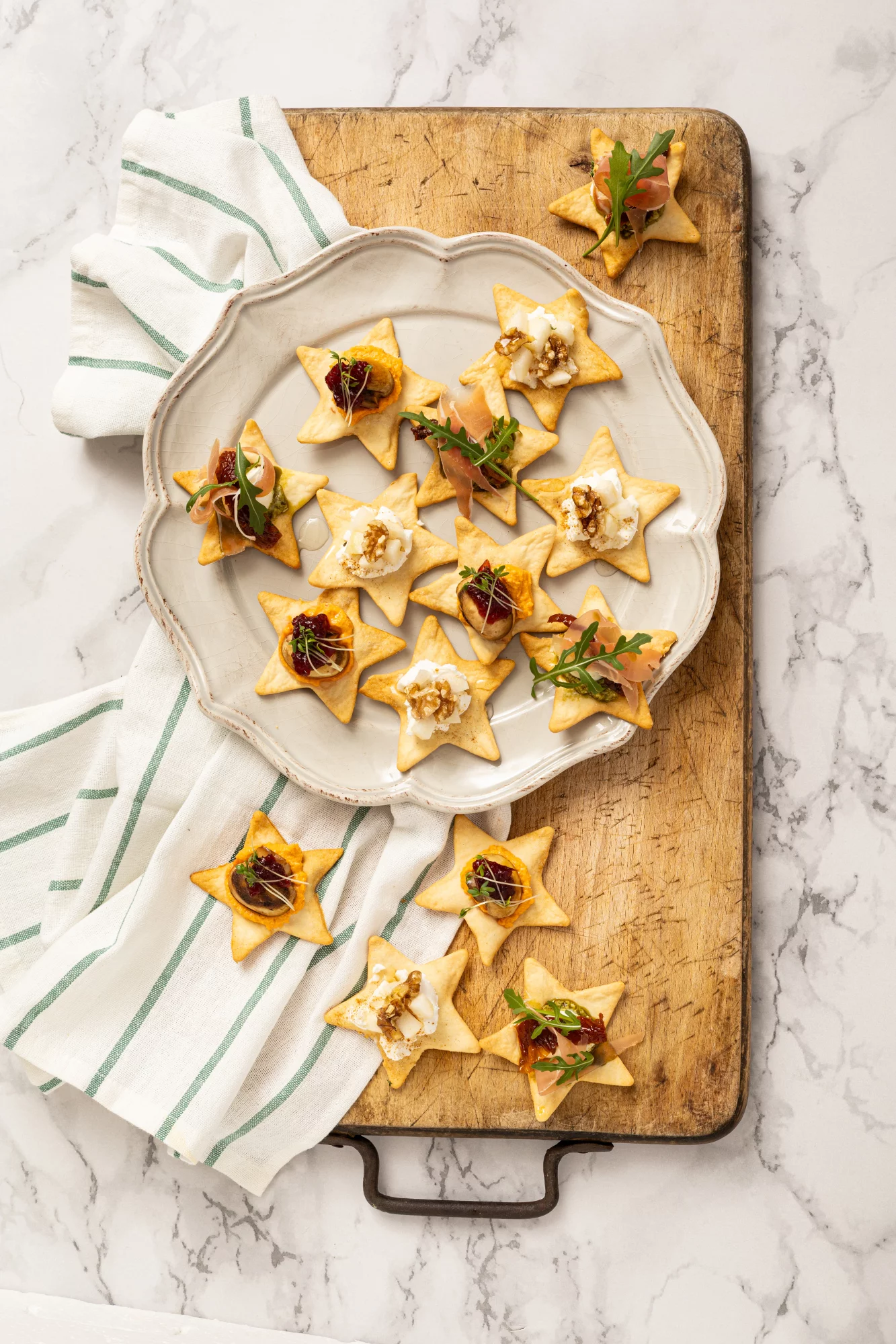 Maak indruk op je gasten met deze feestelijke flammkuchen-crostini’s! Met knapperige deegsterren als basis serveer je in een handomdraai drie verschillende toppings: van vegan met champignons en cranberry tot vegetarisch met geitenkaas en peer, of klassiek met prosciutto en pesto. Deze veelzijdige flammkuchen-hapjes zijn dé perfecte snack voor bij de borrel of als verrassend tussengerecht.