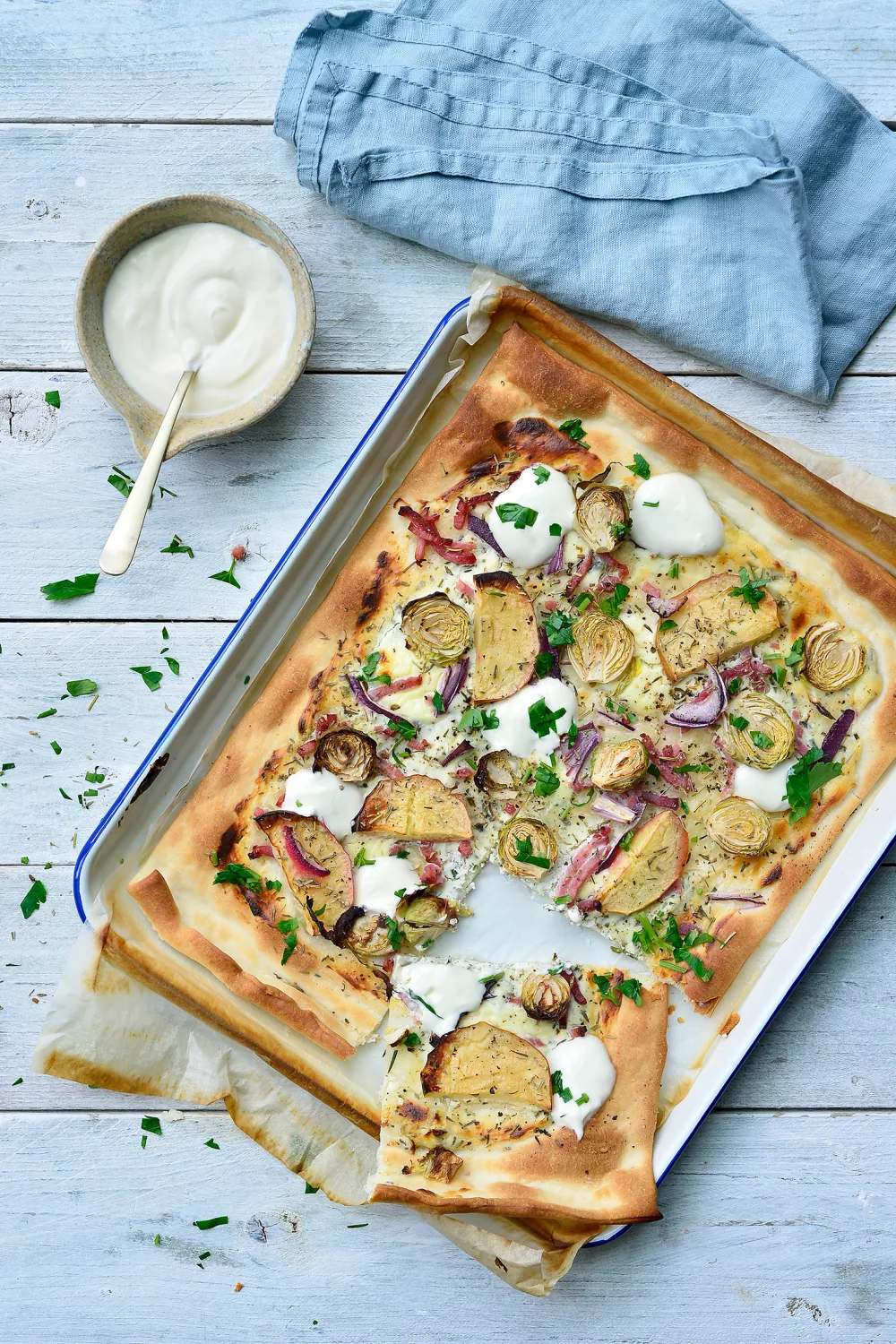 Stappenplan om recept “Flammkuchen met appel, spek en spruitjes” te bereiden