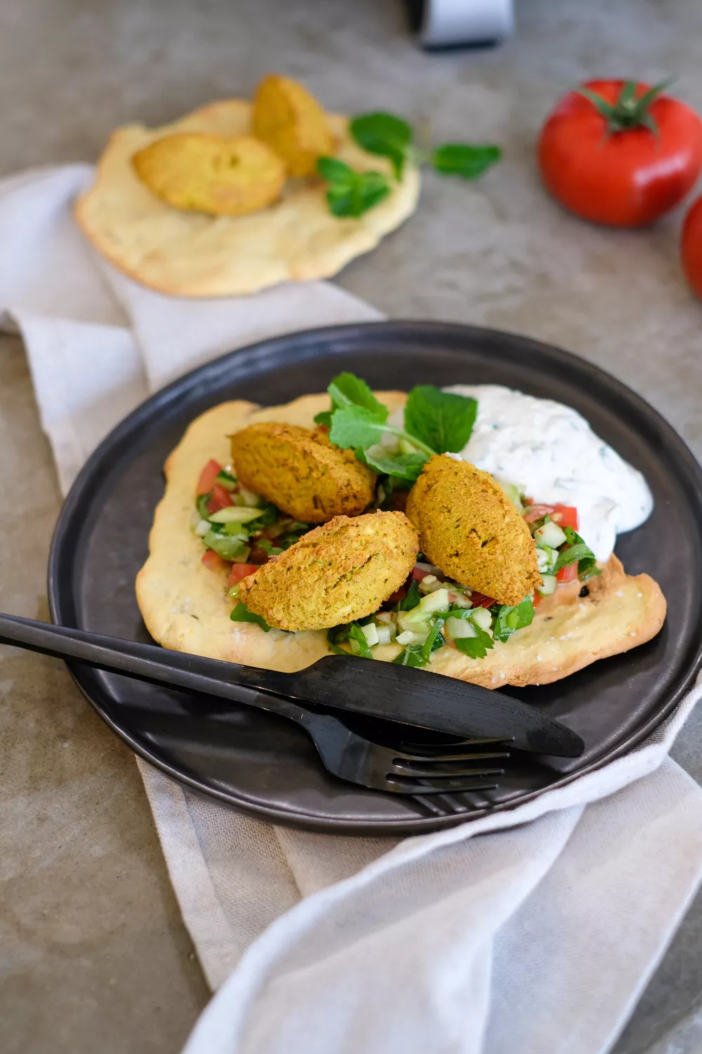 Leg een stuk flatbread op een bord. Leg er wat groentjes en enkele falafelkroketjes bovenop. Werk af met het yoghurtsausje en nog wat extra verse kruiden.