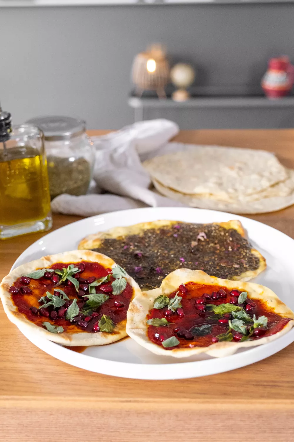 Bak ze gedurende 3 à 5 minuutjes op 220 graden in de oven. Haal de flatbreads uit de oven en werk ze nog af met olijfolie, verse oregano, granaatappel melasse en granaatappelpitjes. Serveer warm.