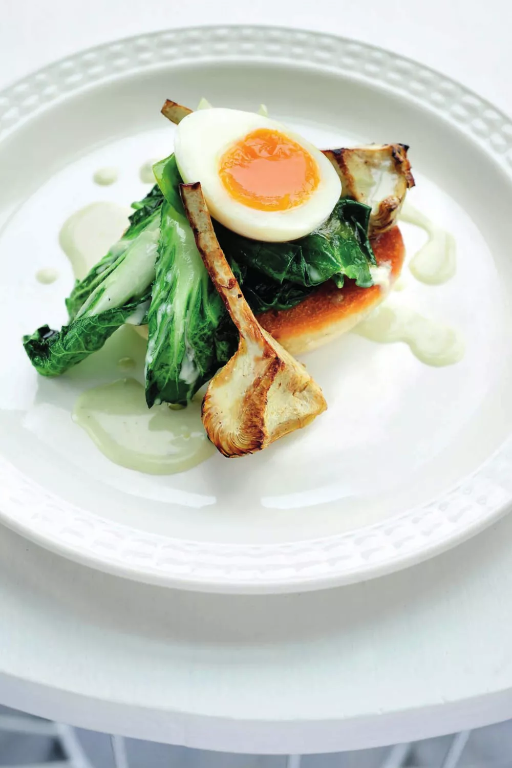 Florentijnse eieren met snijbiet, gebakken artisjok en blauwekaassaus