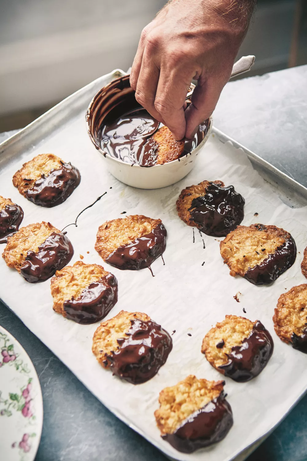 Breek de chocolade in stukjes en leg ze in een hittebestendige Pyrex-kom op een steelpan met zachtjes kokend water. Zorg dat het water de kom niet raakt. Zet als de chocolade is gesmolten het vuur uit en doop de florentines voor de helft in de chocolade om ze rijkelijk te bedekken. Leg de florentines terug op de bakplaat tot de chocolade volledig is uitgehard. Je kunt ze ook 30 minuten in de koelkast zetten om het proces te versnellen, maar eet ze wel op kamertemperatuur op.