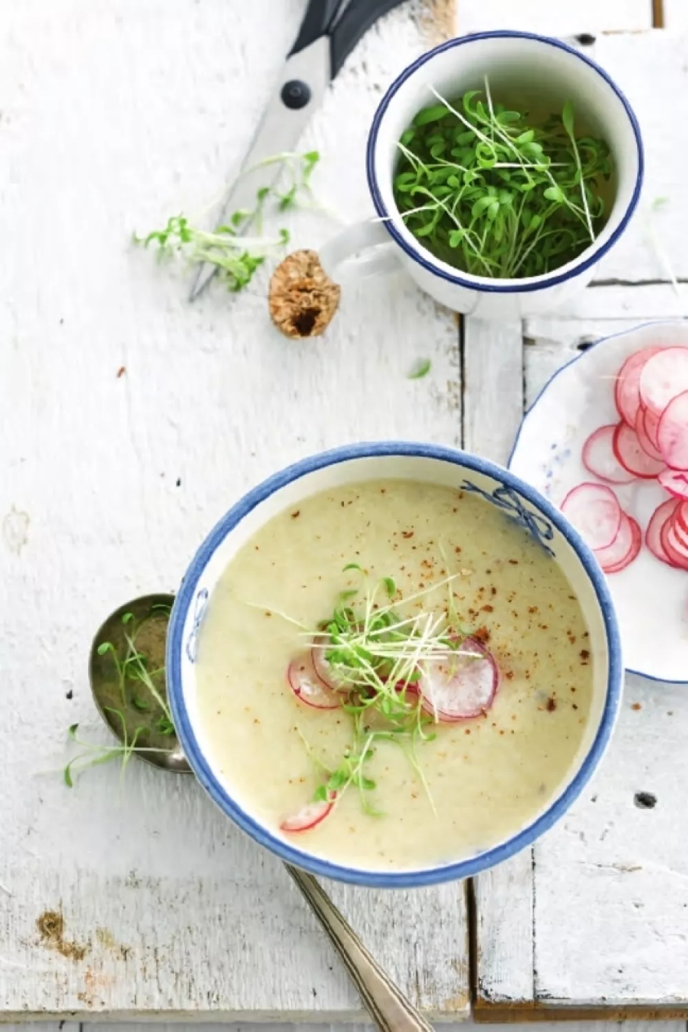 Werk de soep net voor het serveren af met radijs en tuinkers.