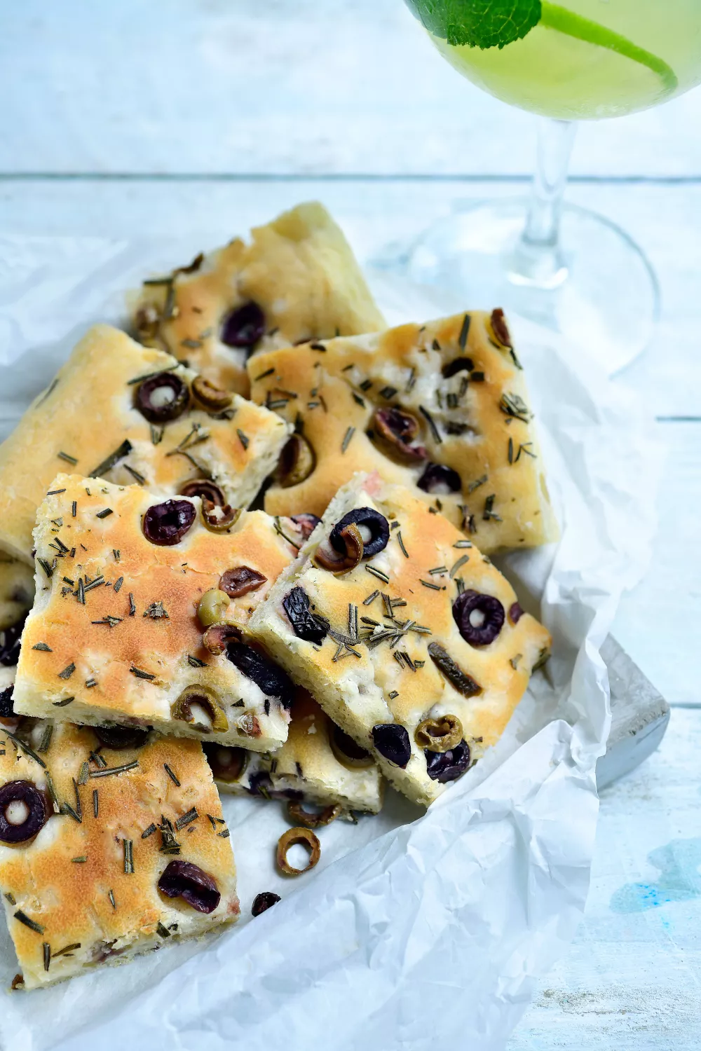 Deze geurige focaccia met groene en zwarte olijven, verse rozemarijn en grof zeezout brengt mediterrane smaken op tafel. Het zacht en elastisch deeg wordt makkelijk gekneed, kort gerezen en in de oven goudbruin gebakken, ideaal voor een gezellige borrel of als bijgerecht bij een zomerse maaltijd. Serveer warm met een scheut extra olijfolie.