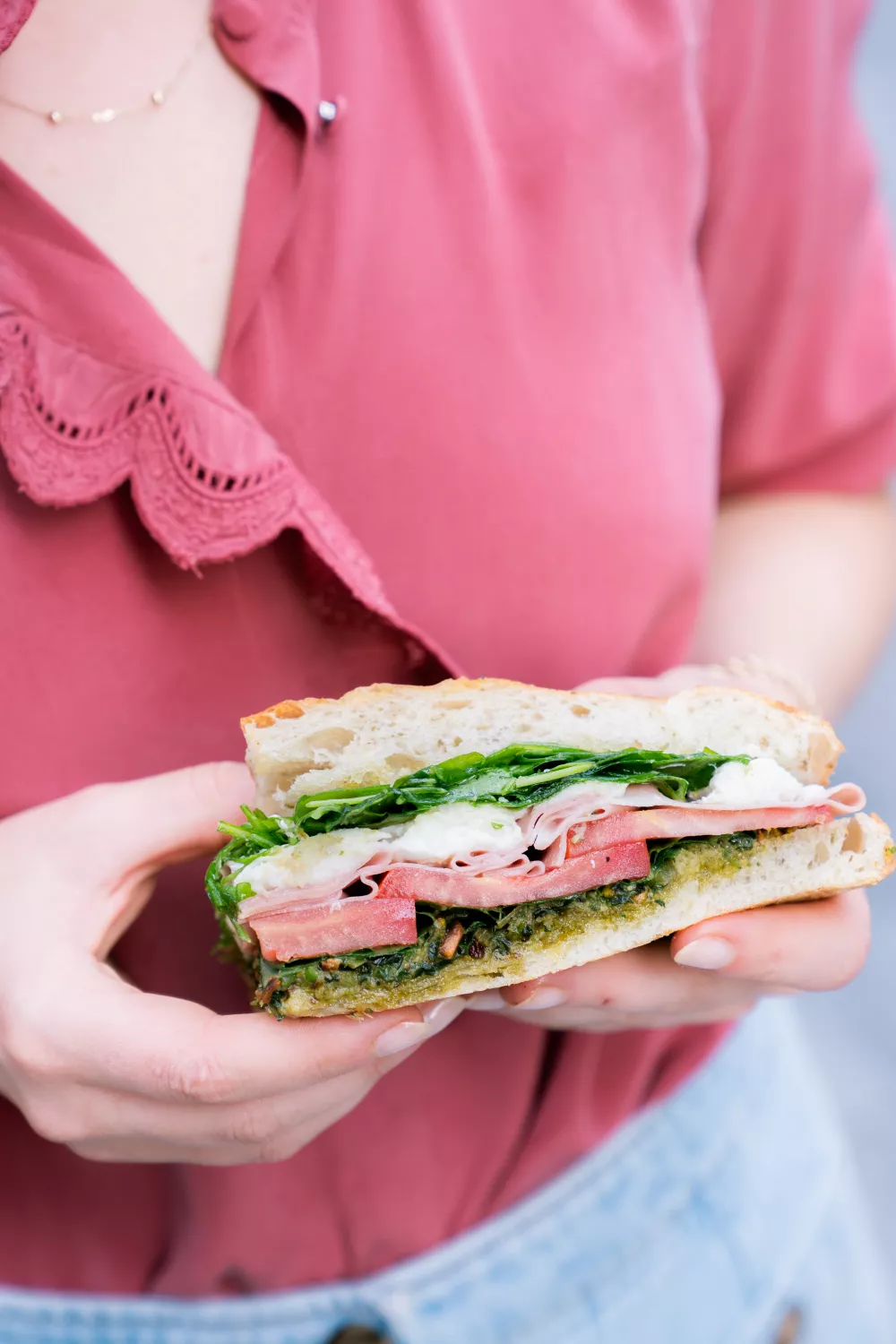 Een luchtige focaccia belegd met romige pistachepesto, dunne sneetjes mortadella en zachte buffelmozzarella brengt Italiaanse smaken naar je lunchtafel. Geroosterde pistachenoten, verse basilicum en Parmezaanse kaas geven de pesto een nootachtige diepte en rijke textuur. Afgewerkt met rucola en een scheut citroensap is dit broodje ideaal voor een zomerse picknick, lichte lunch of gezellige borrel.