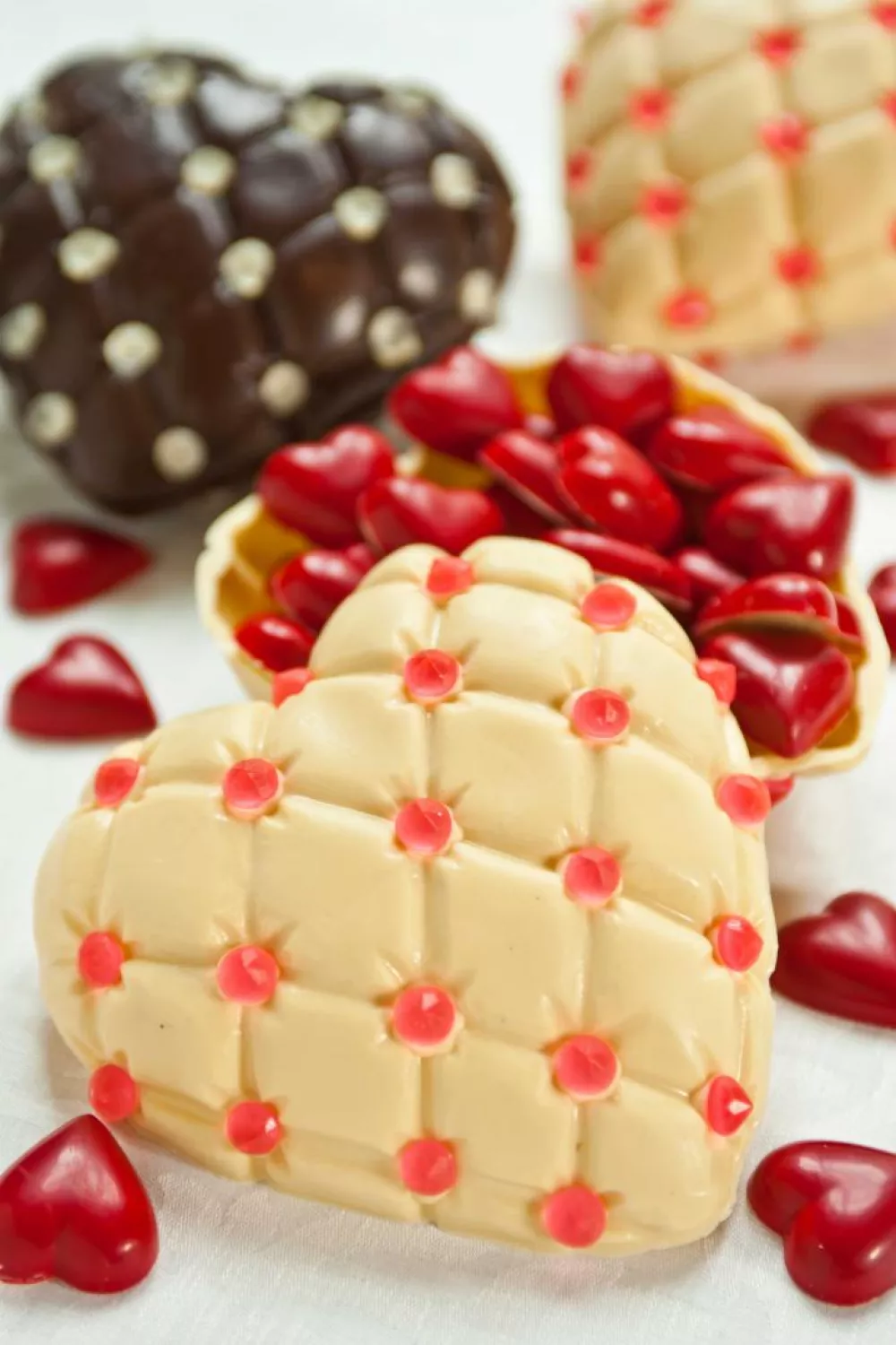 Verleidelijke frambozenhartjes van witte en donkere chocolade die smelten op de tong dankzij een romige frambozenganache en een krokante, getempereerde buitenkant. Met witte chocolade, cacaoboter en een vleugje vetoplosbare kleurstof creëer je levendige, feestelijke pralines; microgolfverwarming en tempereren zorgen voor glans en knap. Ideaal als valentijnstraktatie, feestelijk cadeau of zomers dessert.