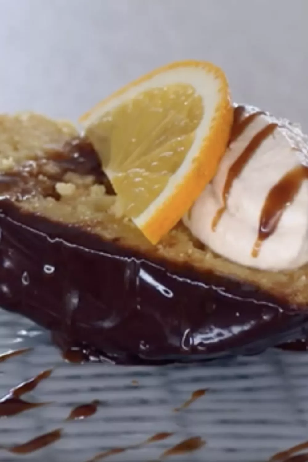 Haal de cake uit de koelkast en snijd in stukjes. Dresseer een stukje cake mooi op een bordje. Lepel er wat chai room over en werk af met het koffie-karamelsausje en een schijfje sinaasappel.