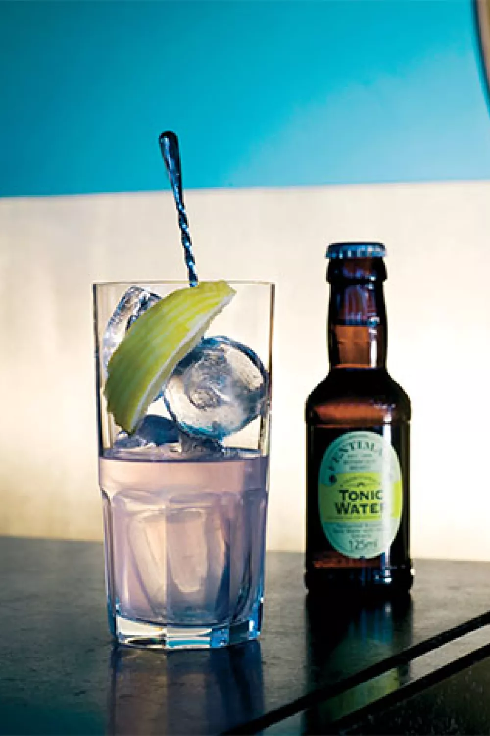 Vul het glas met ijsblokjes, giet de cocktail erbij en vul op met tonic. Serveer met een roerstaafje en een partje citroen.