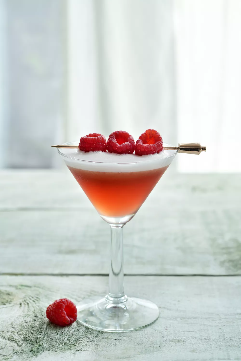 Plaats de frambozen in een shaker en muddle ze tot sap. Voeg de overige ingrediënten toe en vul de shaker verder op met ijsblokjes.