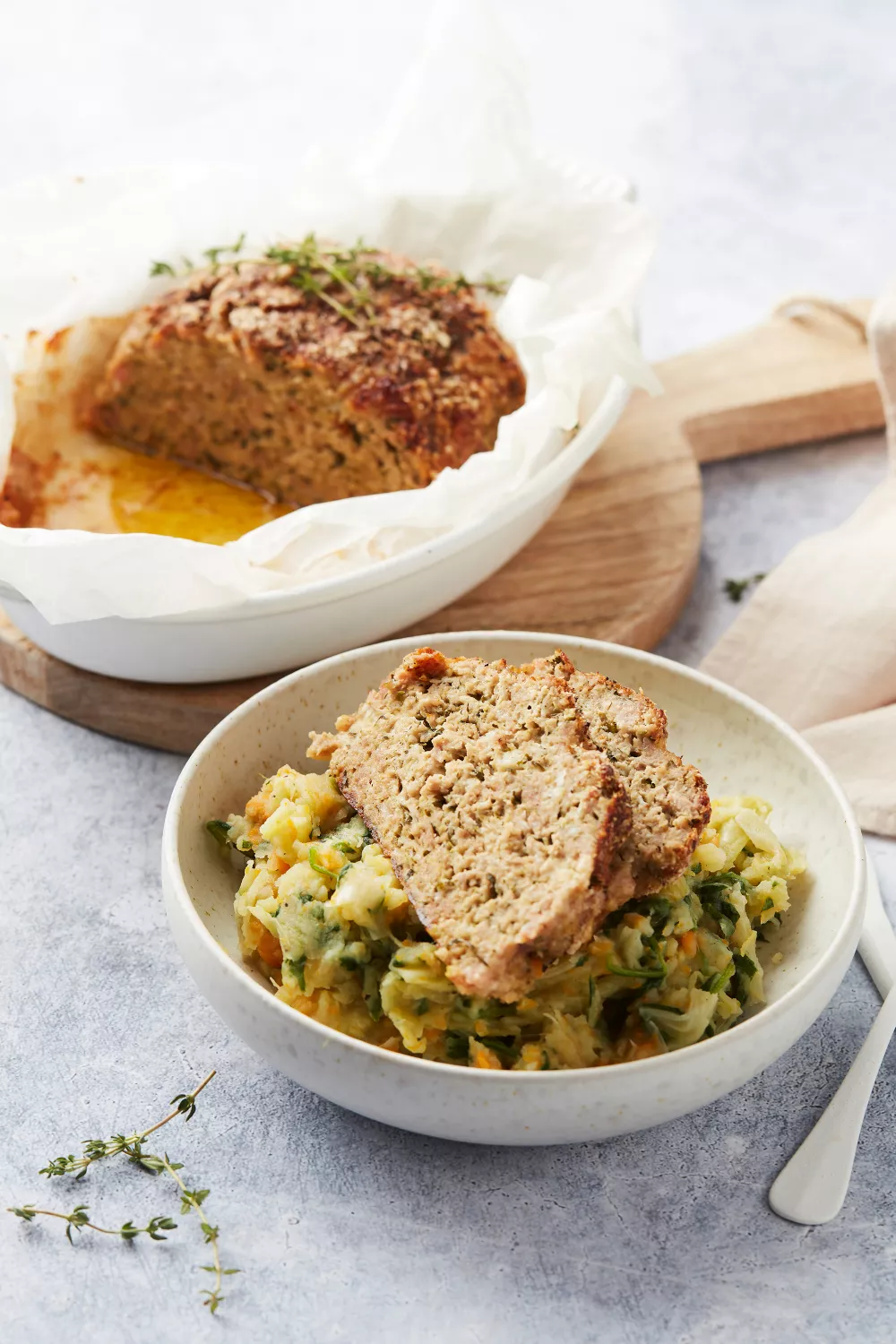Hartig en sappig fricandon van kalfsgehakt met courgette en verse kruiden, in de oven gebakken tot een mooie goudbruine korst. In plakken geserveerd met een romige, fijngestampte groentepuree van aardappel, wortel, prei en spinazie levert dit een warm familiediner op dat ideaal is voor doordeweekse avonden en frisse herfstdagen.