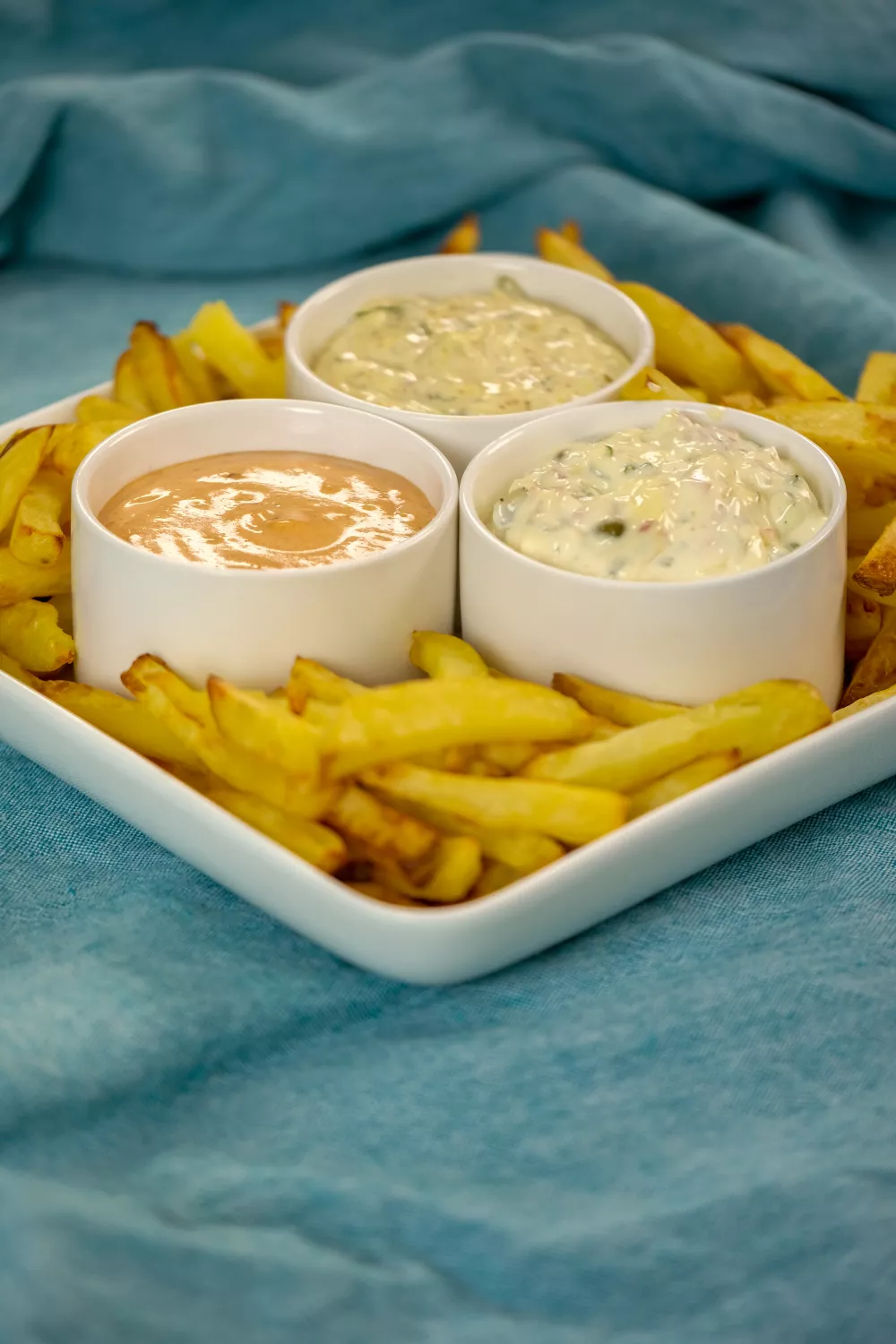 Serveer de frietjes samen met de sausjes.