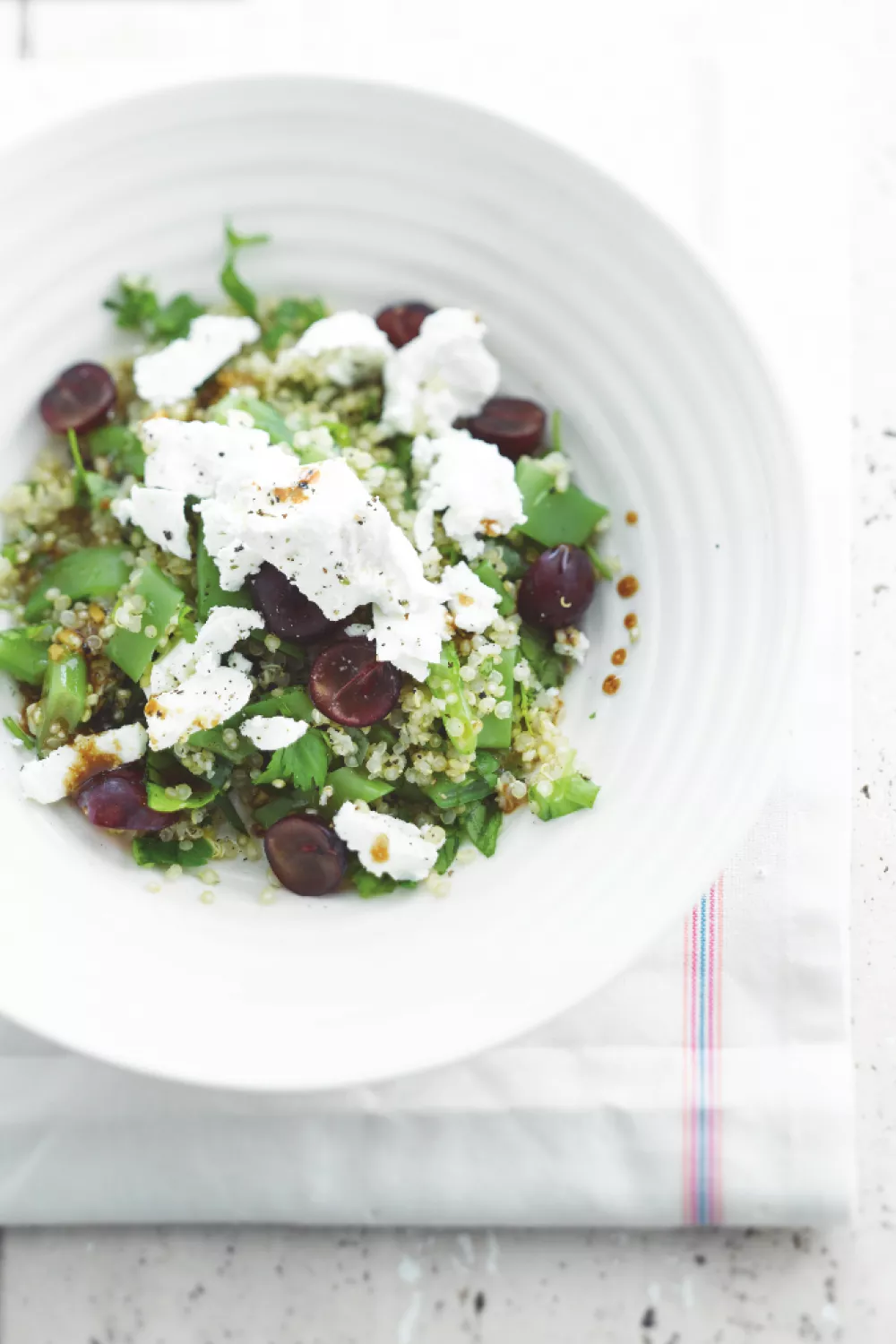 Een fris slaatje met quinoa, feta en een mix van peterselie, koriander en dille brengt kruidige, heldere smaken met ziltige Parmezaanse kaas en zoete blauwe druiven. De quinoa wordt gekookt en de snijbonen kort geblancheerd, waarna alles wordt gemengd met een vinaigrette van honing, balsamico en olijfolie voor een fijne balans tussen zoet en zuur. Perfect als gezonde quinoasalade voor lunch, picknick of zomers bijgerecht met mediterrane inslag.