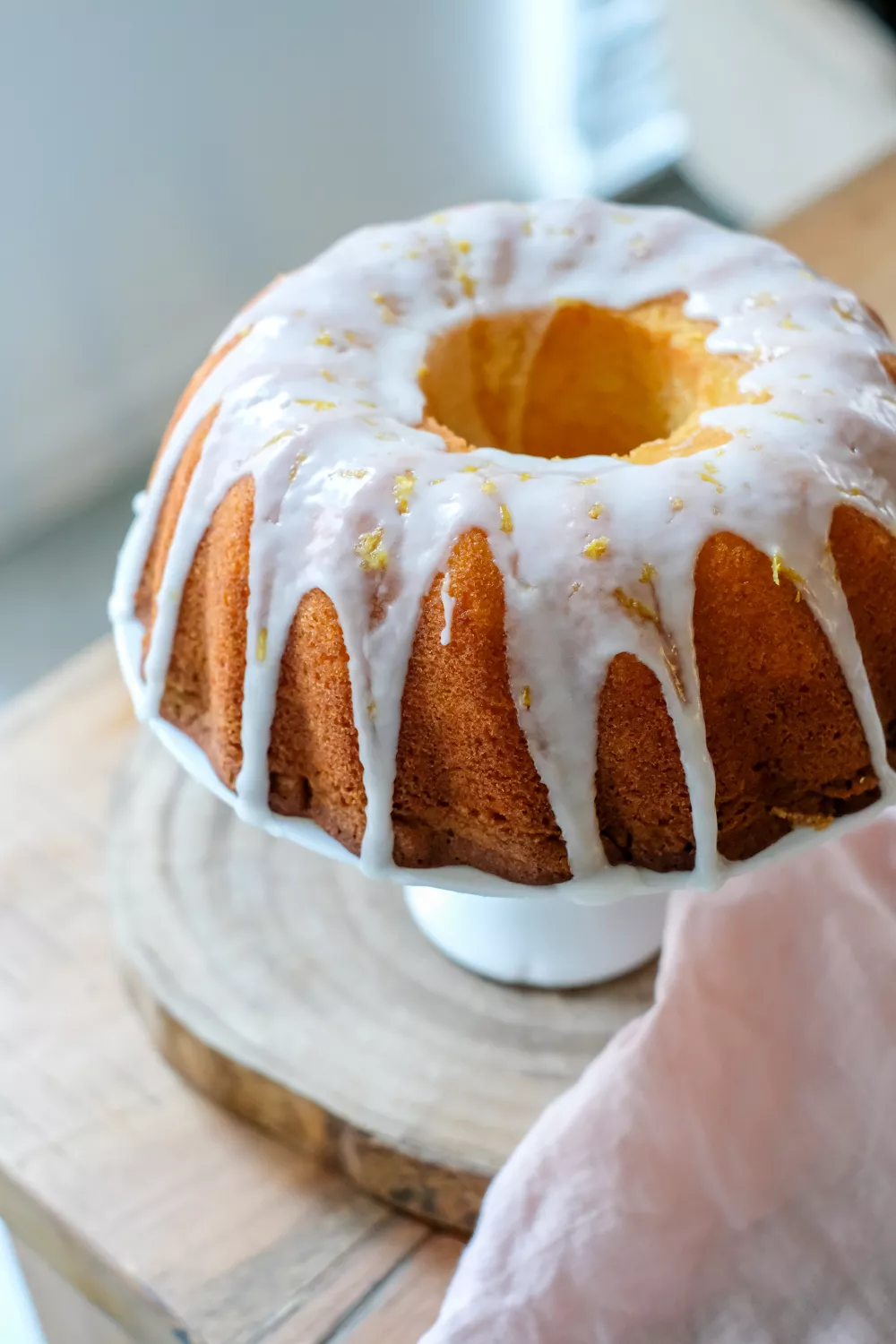 Meng enkele druppels citroensap met de bloemsuiker in een kommetje tot een mooi suikerglazuur. Doe het glazuurlaagje op een volledig afgekoelde cake. Werk af met extra zeste van citroen.
