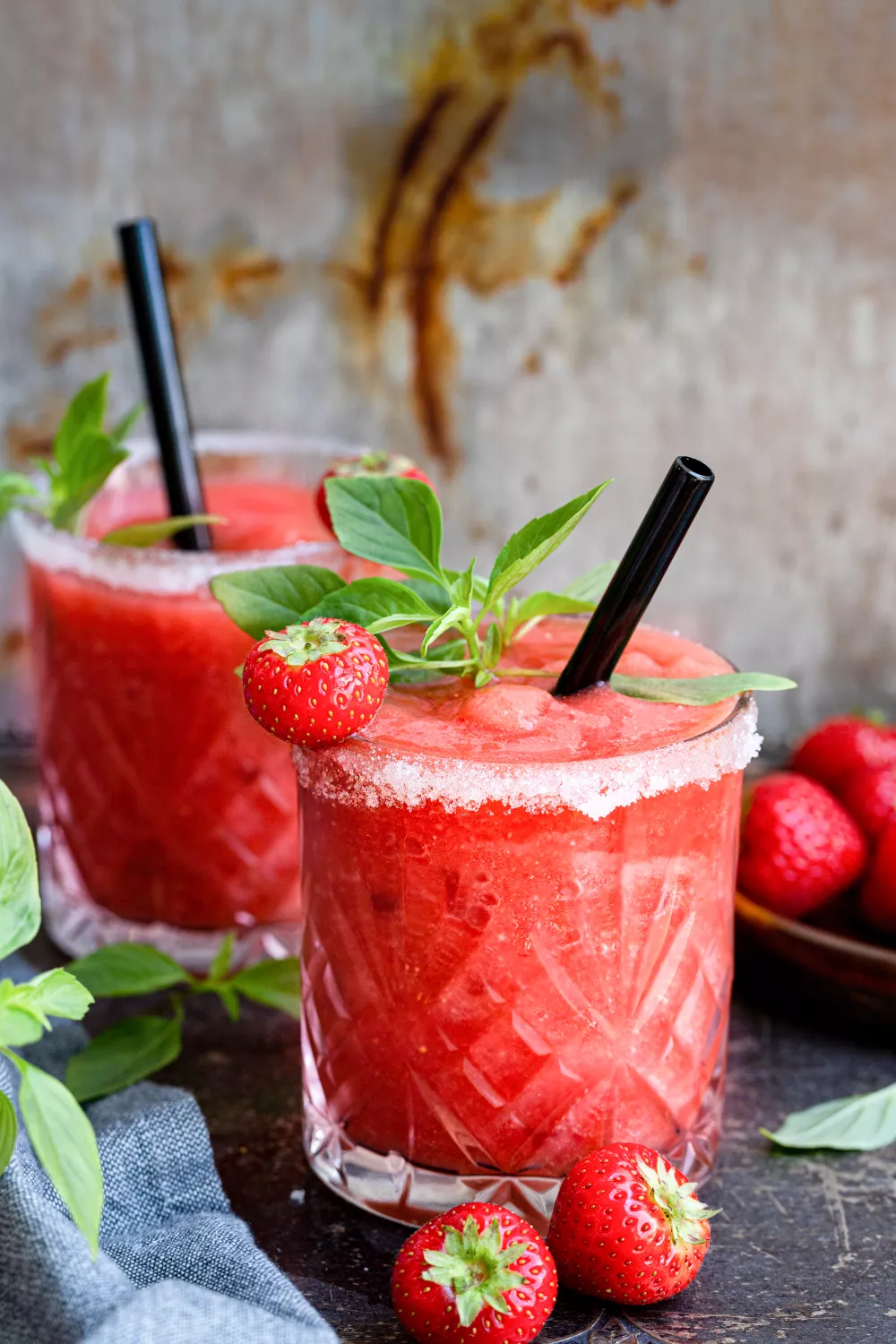 Een verfrissende Frozen Strawberry Margarita met rijpe aardbeien, tequila en Grand Marnier brengt zomerse fruitigheid en een subtiele basilicumtoets naar je glas. In één simpele blenderstap mix je limoen, honing en veel ijs tot een smeuïge cocktail die je met een gezouten rand extra pit geeft. Ideaal voor een zonnige borrel, tuinfeest of als cocktail na een zomerse barbecue.