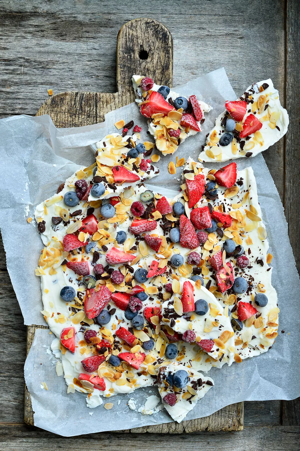 Frisse frozen yoghurt met romige Griekse yoghurt en milde agavesiroop, verrijkt met rozijnen en een mix van frambozen, blauwe bessen en aardbeien. Geroosterde amandelen en pure chocolade geven een knapperige, rijke toets. Makkelijk te maken zonder ijsmachine en perfect als zomers dessert, brunch of lichte snack.