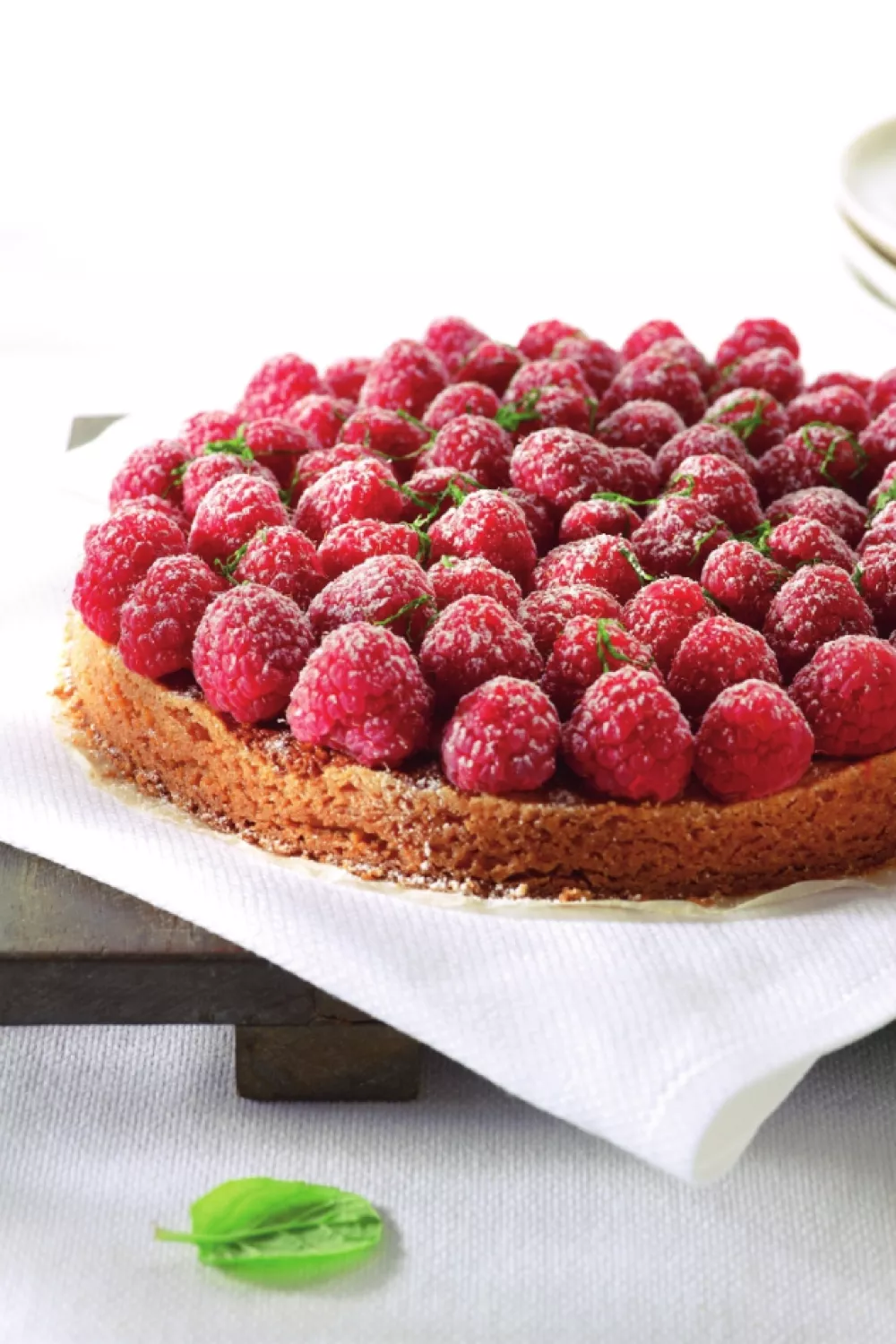 Beleg de taartjes met frambozen. Werk af met enkele blaadjes munt, de geraspte limoenschil en een beetje poedersuiker.