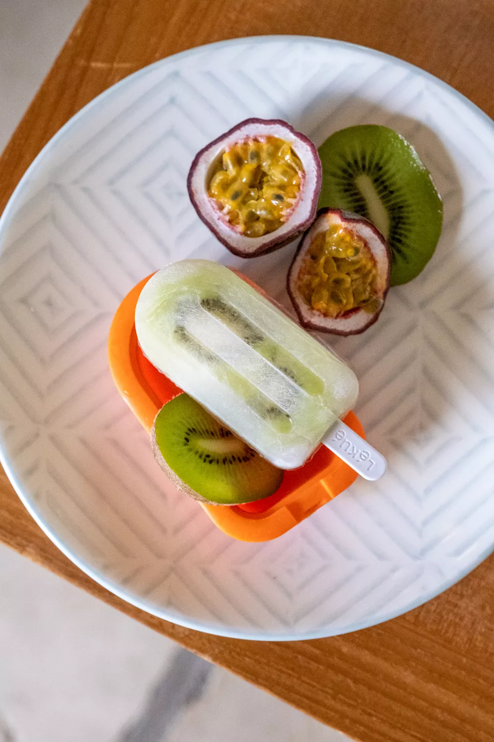 Giet de kokosmelk in de ijsvormpjes. Lepel er de pitjes van de passievruchten over. Zet in de vriezer.