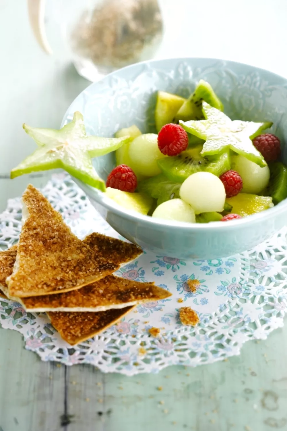 Haal de tortillas uit de oven, breek ze in stukken en serveer ze bij de fruitsalade.