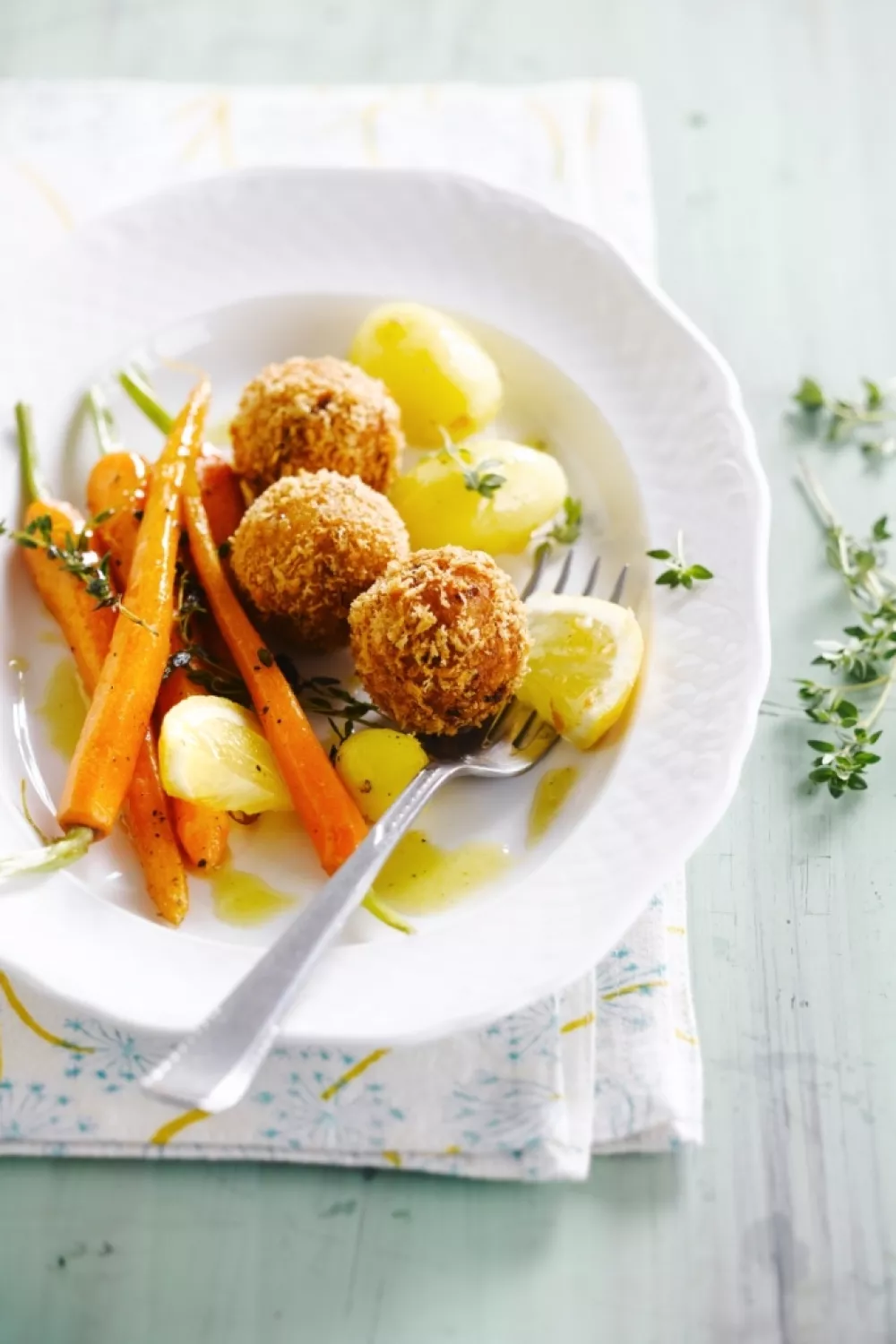 Serveer de garnaalballetjes heet, met de gestoofde wortelen en gestoomde aardappelen. Geef er een schijfje citroen bij.