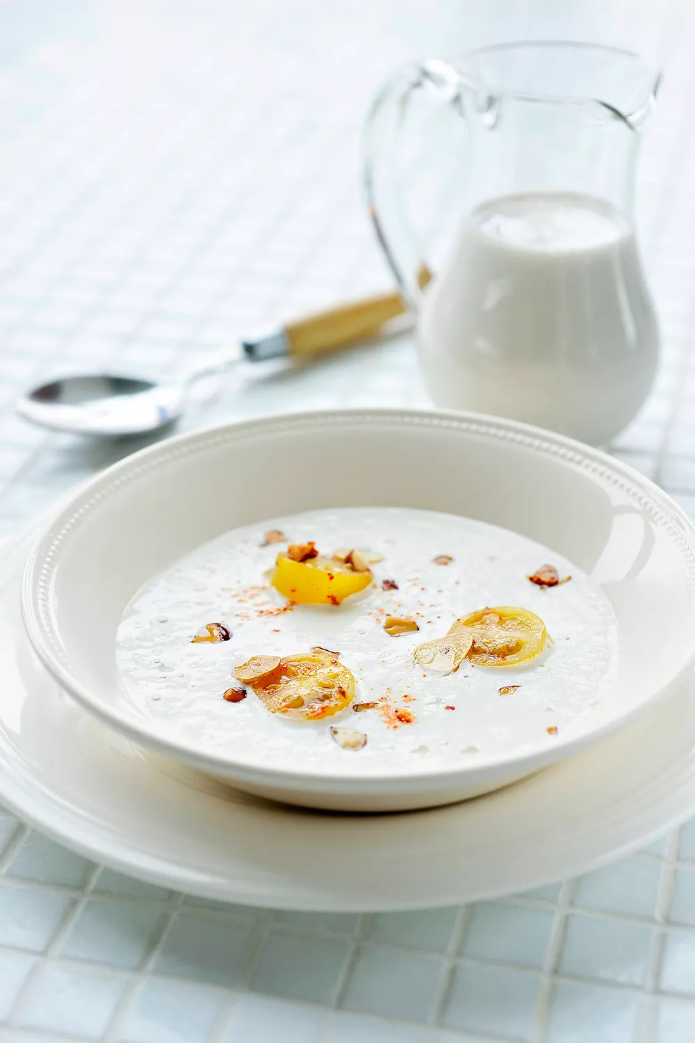 Gazpacho van amandel met gele tomaatjes en piment d'espelette