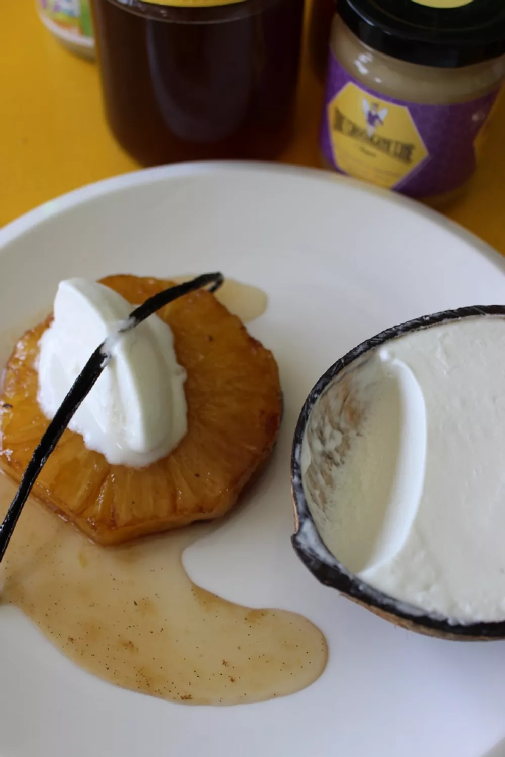 Serveer de gekarameliseerde ananasschijven met een bolletje kokosijs en een lepeltje van de siroop.