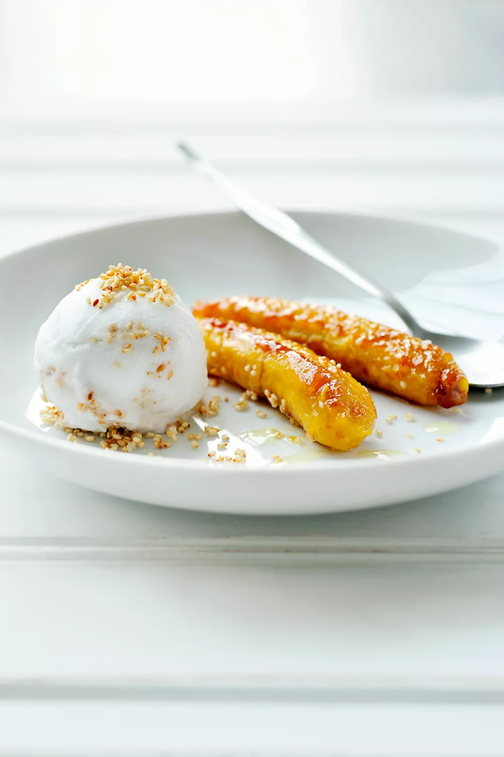 Serveer de gebakken banaantjes met de kokossorbet en werk af met wat gekaramelliseerde sesamzaadjes.