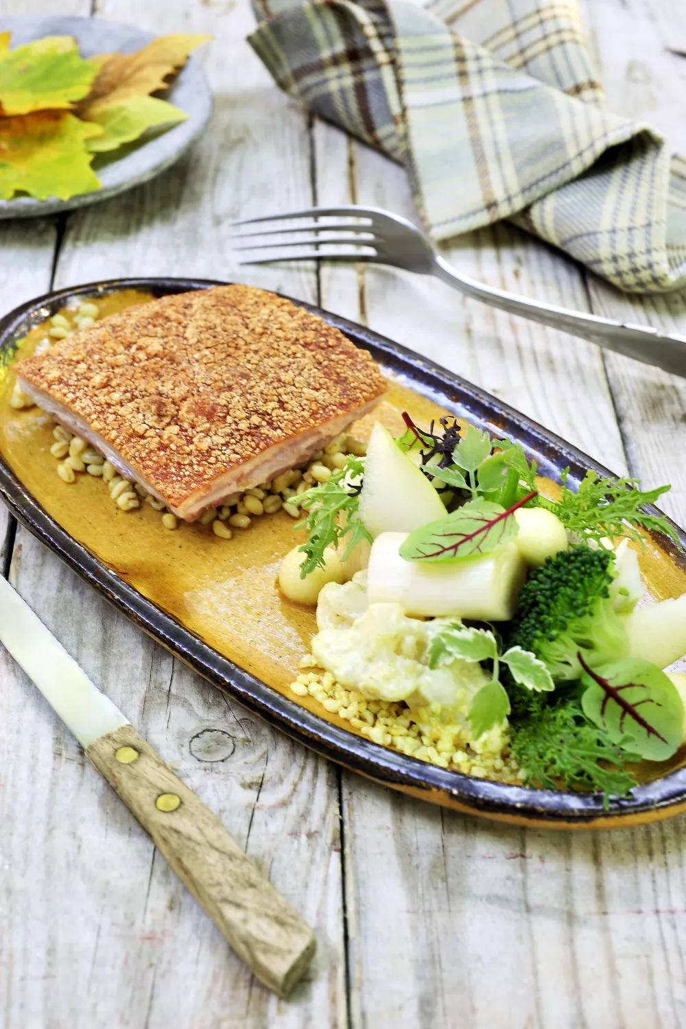 Serveer het buikspek met gekarameliseerde appeltjes, de bloemkoolroosjes, prei en tarwekorrels.