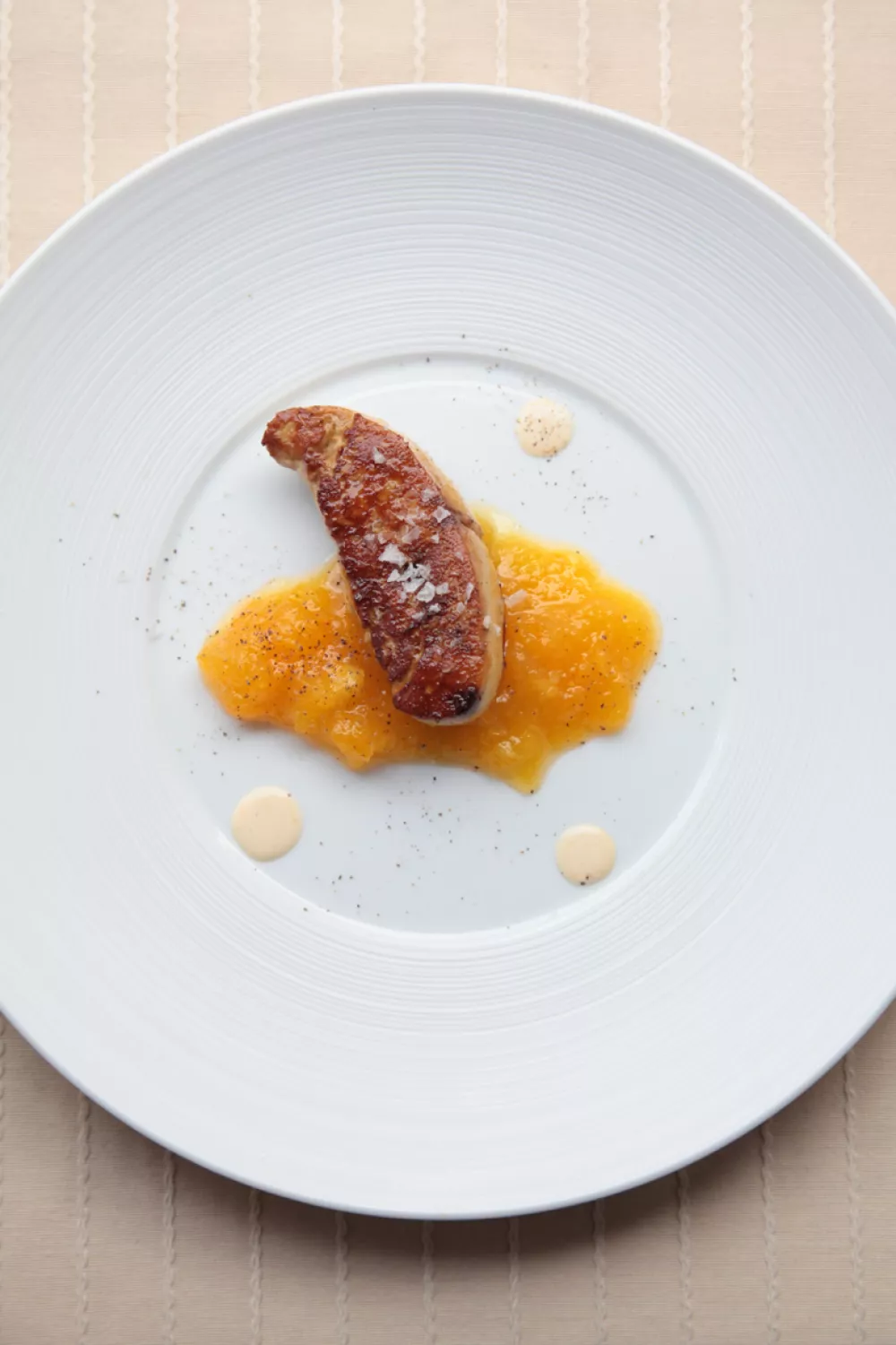 Leg de confituur midden op het bord. Leg de lever er schuin op. Werk af met enkele druppels jus en wat amandelmelk.