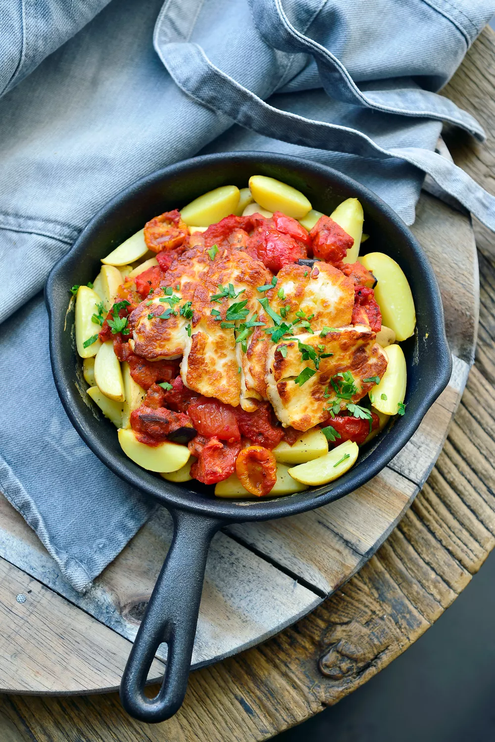 Deze mediterrane vegetarische schaal combineert goudbruin gebakken halloumi met knapperige krielaardappelen en een rijke tomatensaus met aubergine, paprika en zongedroogde tomaatjes. De groenten worden zacht gestoofd met knoflook en Italiaanse kruiden terwijl de halloumi kort in olie bakt voor een hartige, licht gesprongen korst. Perfect voor een makkelijk doordeweeks hoofdgerecht of een zomers diner met vrienden.