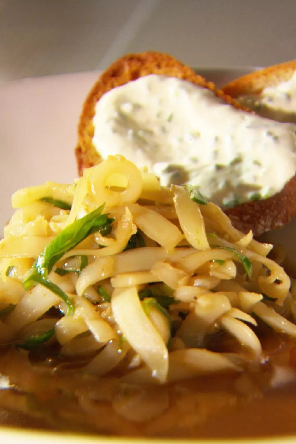 Zacht gestoofde ajuin vormt de diepe, zoetige basis van deze siroperige bouillon waarin krokant gebakken pijlinktvis schittert. Met geroosterd stokbrood en romige looksaus krijgt elk hapje een spannend contrast van knapperigheid en zachtheid, opgehelderd door limoenzeste en umami van sojasaus en mirin. Perfect als elegant voorgerecht of zomerse bite bij een glas witte wijn.
