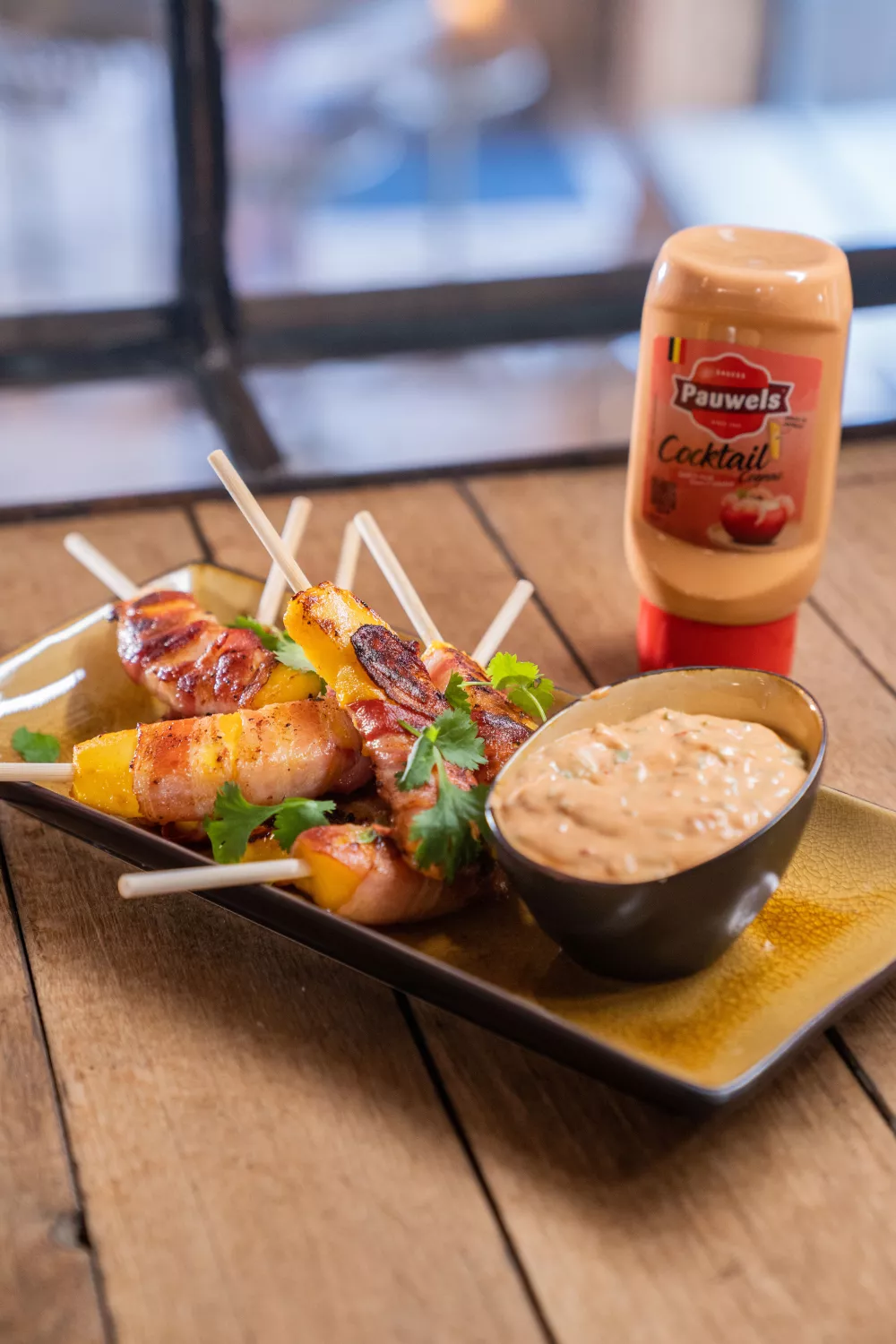 Zoete mango omwikkeld met krokant ontbijtspek en kort gebakken in de pan vormt de basis van deze frisse borrelsnack, ideaal voor zomerse avonden of als tapas. Een pittige cocktailsaus met limoen, geraspte knoflook, chili en koriander geeft extra frisheid en diepte. Serveer de mangosticks op stokjes als fingerfood bij een feestje of aperitief.