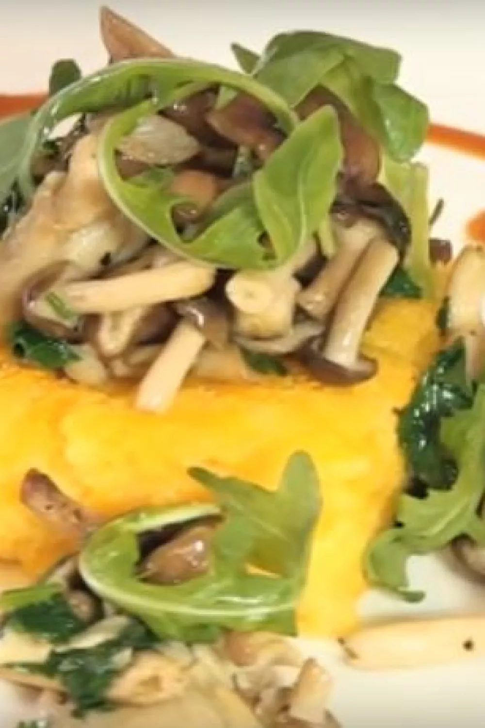 Snijd een plakje van de polenta. Schep er wat van de gebakken paddenstoelen over. Giet er een scheutje jus van de geroosterde groenten bij en werk af met een handje ruccola op smaak gebracht met enkele druppels notenolie.