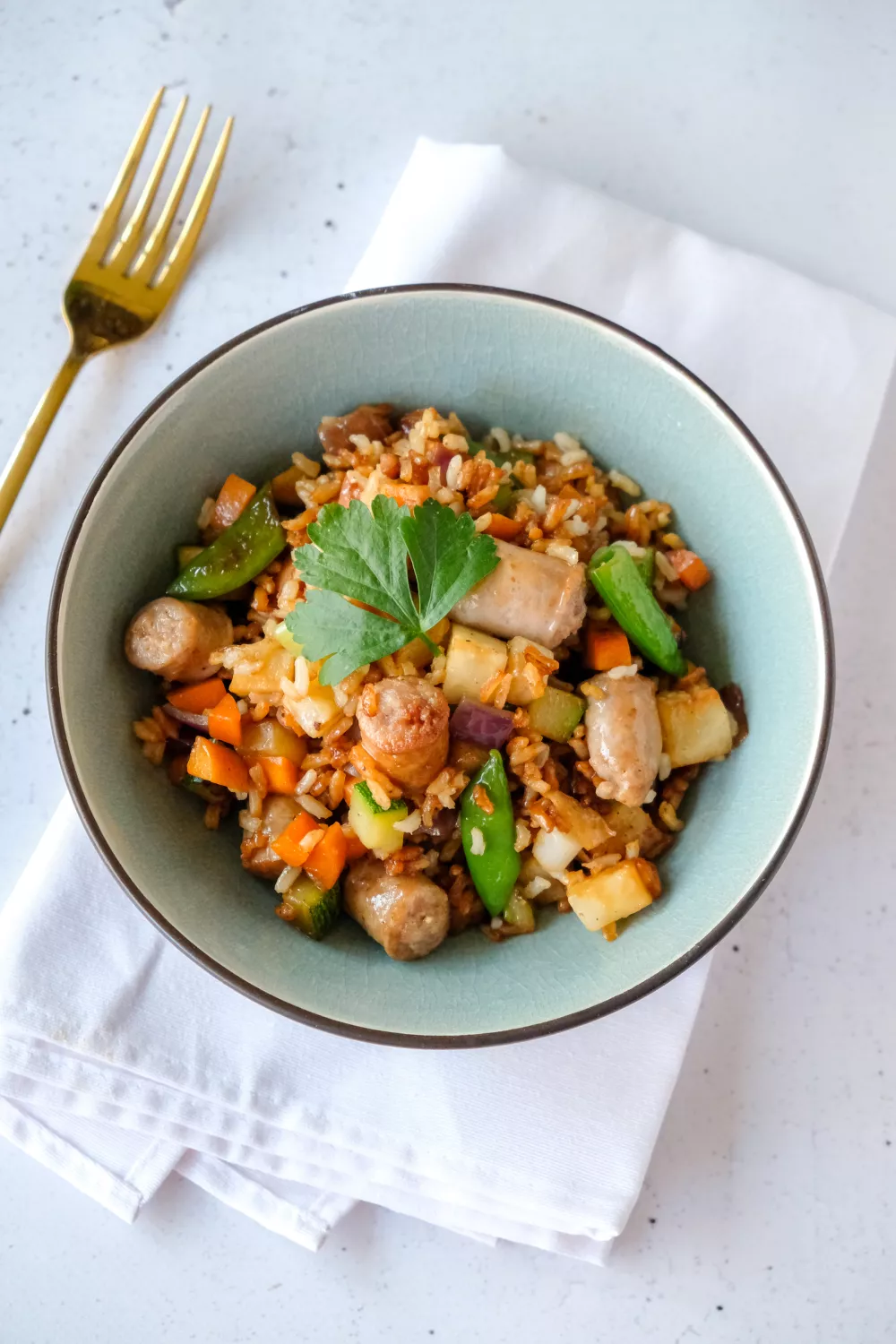 Een hartige, snelle gebakken rijst met volkorenrijst, sappige worstjes en een kleurrijke mix van wortel, courgette, knolselder en sugar snaps. In de wok gewokt en afgeblust met sojasaus krijgt dit een knapperige bite en rijke umami, perfect als voedzaam eenpansgerecht voor een doordeweeks familiediner of een gezellige maaltijd in elk seizoen. Simpel, vullend en boordevol groenten.