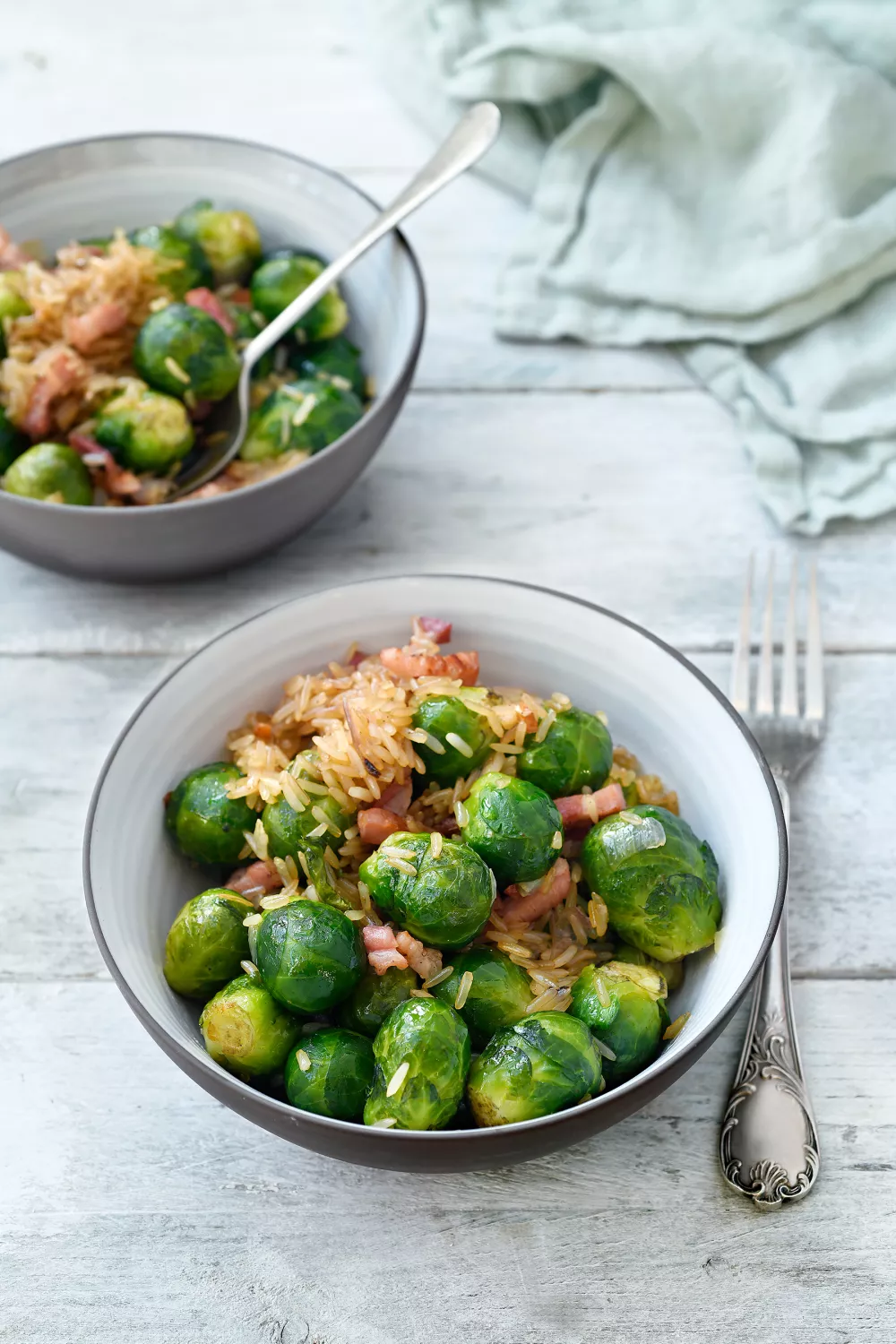 Serveer de rijst-spruitjesschotel in kommetjes en werk af met de gebakken spek- of hamblokjes.