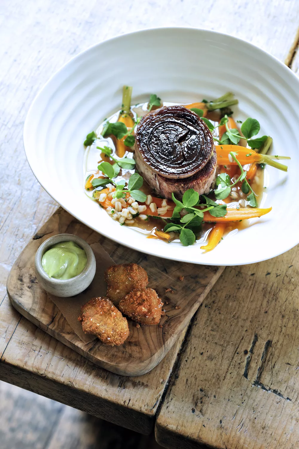 Snij 6 dikke sneden van het lamsvlees. Bak langs 2 kanten in een pan met arachideolie. Verwarm een beetje aardappelpuree. Leg een lepel aardappelpuree in elk van de diepe borden. Daarop komt een schijf gebakken lamsvlees. Daarrond komen de wortelen en speltgraan die even werden opgewarmd. Overgiet met de geklaarde saus. Werk af met wat erwtenscheuten. Serveer samen met de daslookmayonaise en de gefrituurde zwezeriken.