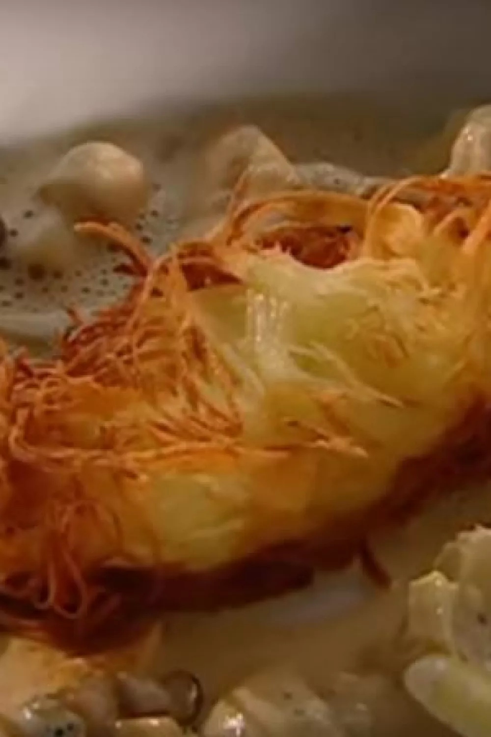 Knapperige gefrituurde steenbolk met een rijke romige saus van bospaddenstoelen is een heerlijk herfstig visgerecht voor een gezellig diner. De vis krijgt een goudbruine korst door bloem, ei en geraspte aardappel en wordt kort nagegaard in de oven. Serveer warm als feestelijk hoofdgerecht bij vrienden of familie.