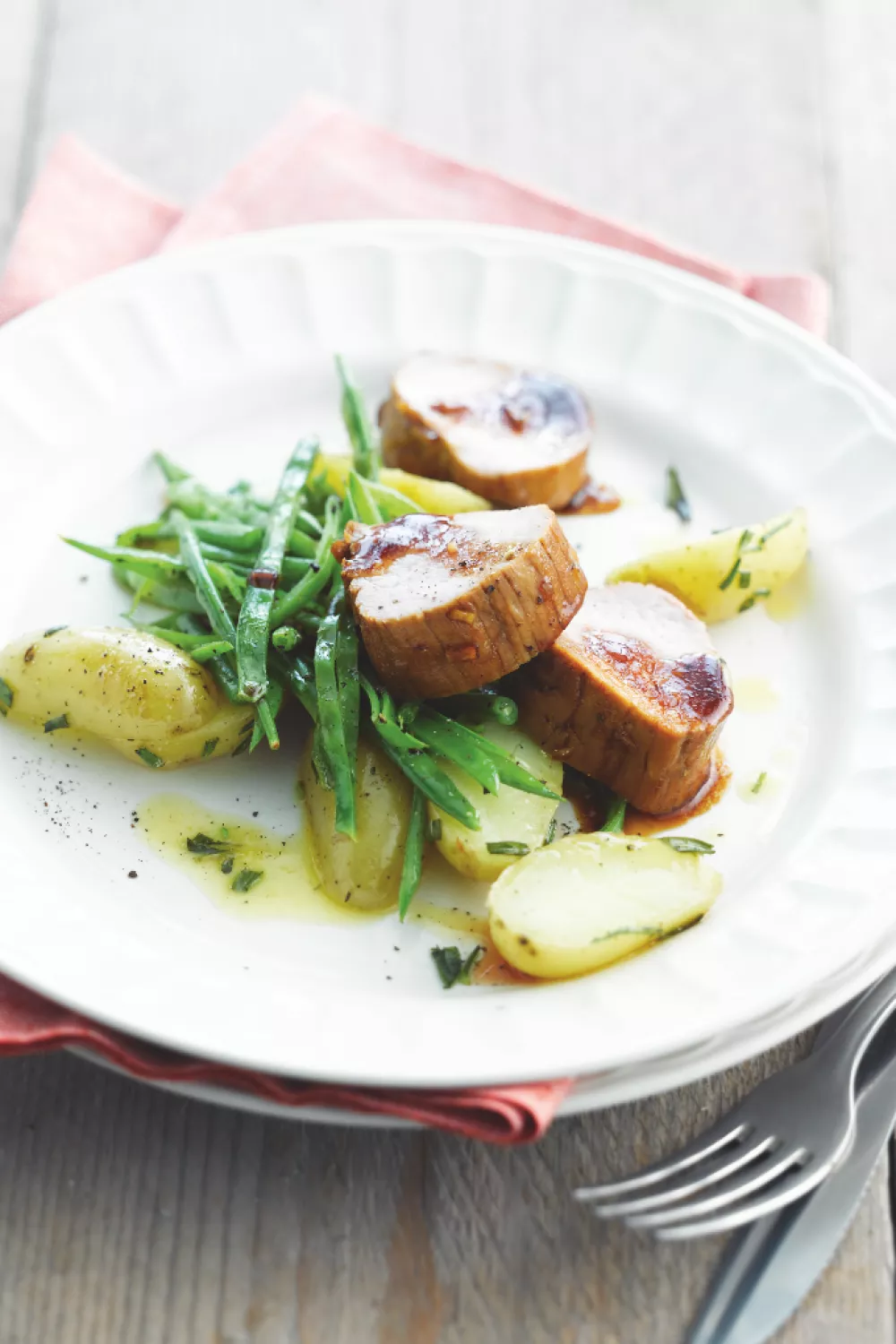 Dit glazeerde varkenshaasje met sperzieboontjes en krieltjes is een hartig hoofdgerecht met een zoetzoute sojaglazuur, knoflook en een vleugje rozemarijn. Het vlees wordt kort in de marinade gewenteld en in de pan gebakken voor een sappige kern, terwijl krieltjes worden gekookt en opgebakken en de boontjes zacht gestoofd. Perfect voor een gezellige doordeweekse avond of een smaakvol diner in elk seizoen.