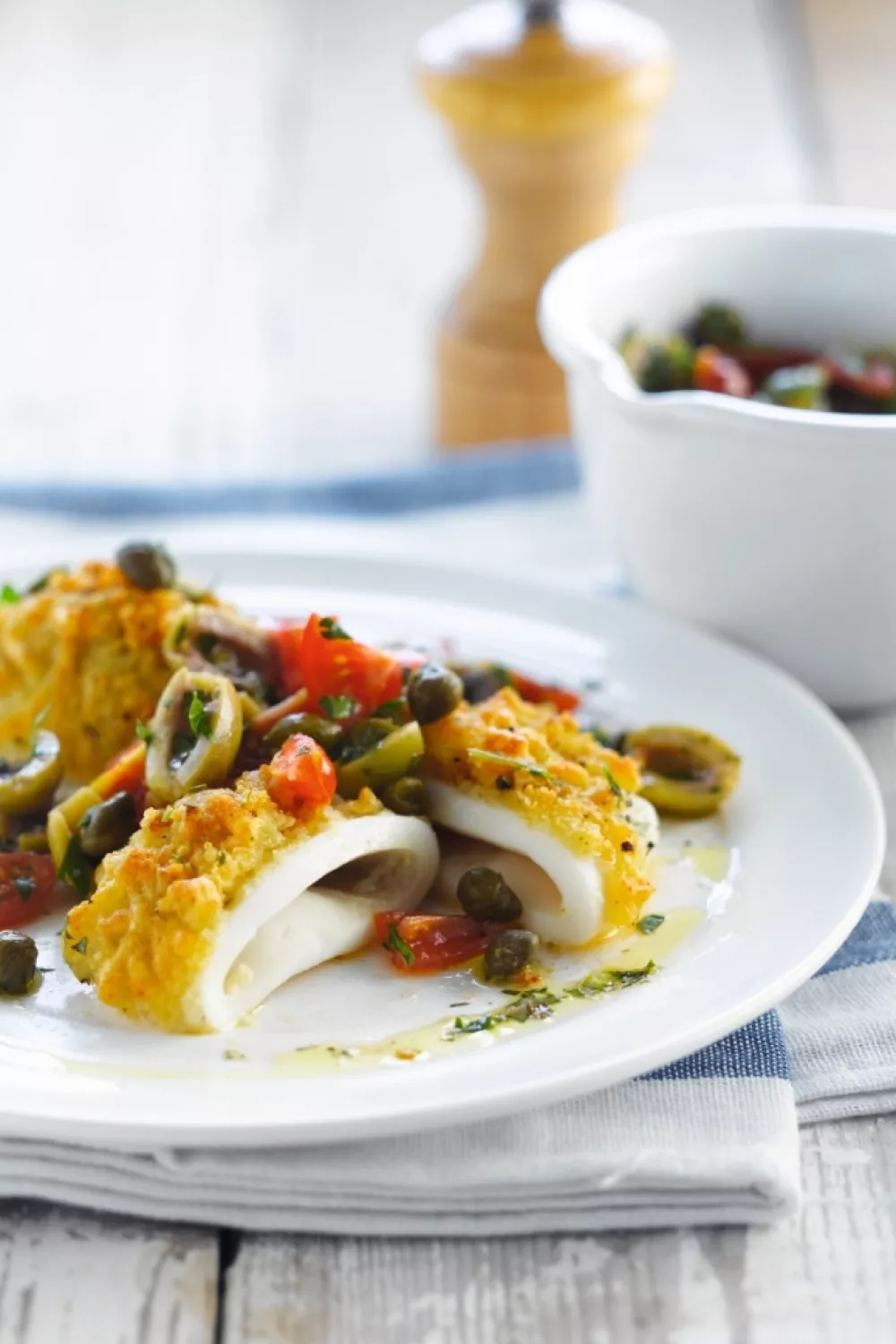 Luchtig gegratineerde inktvis met een knapperig kaaslaagje en paneermeel, geserveerd met een frisse salsa van olijven, kappertjes en kerstomaatjes op smaak gebracht met knoflook, citroen en peterselie. In de oven krijgt de inktvis een goudbruine korst terwijl het vlees mals blijft door kort garen. Perfect als Mediterrane zomerse hoofdschotel, tapas of feestelijke borrel waarbij zeevruchten en citrus samenkomen.