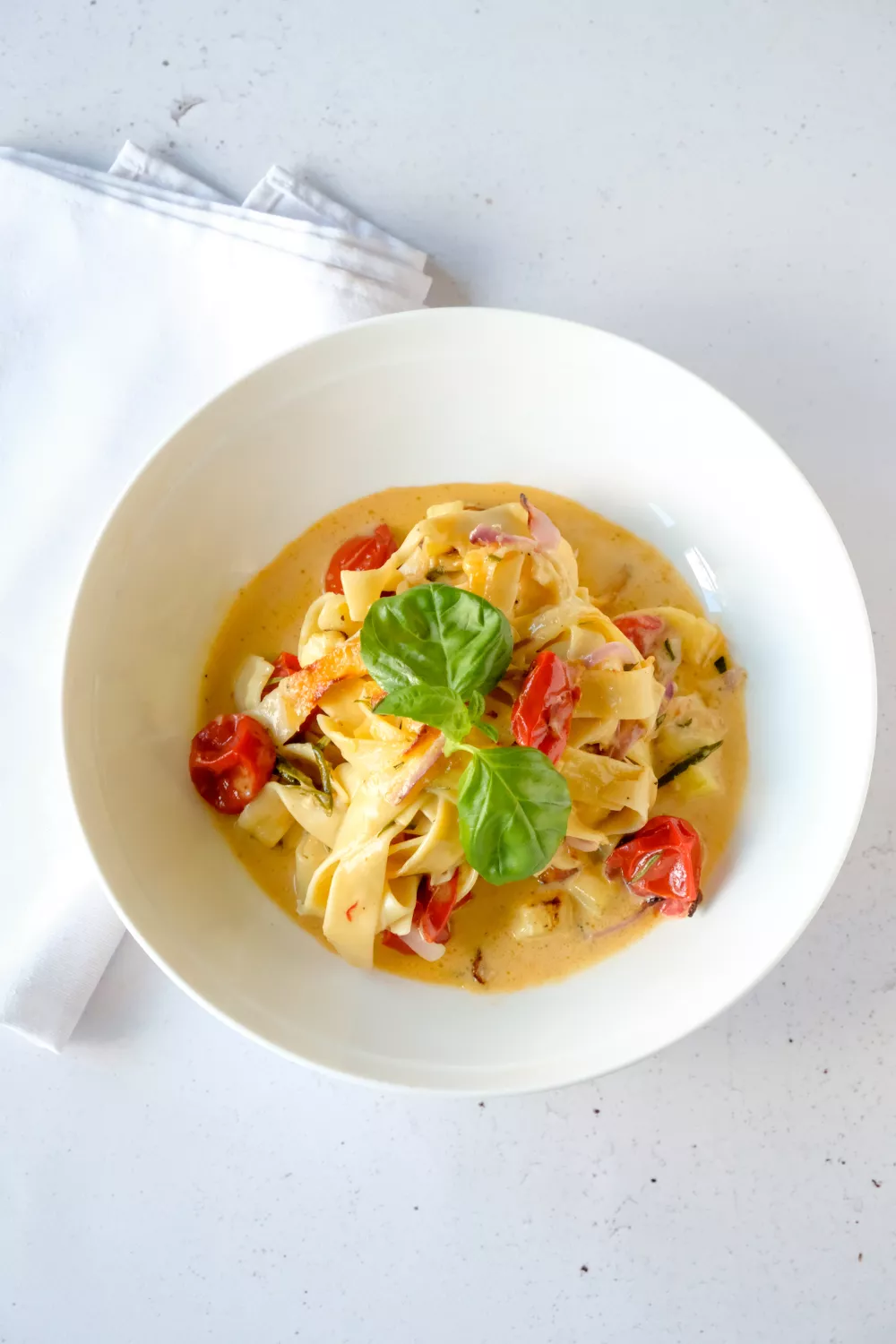Deze gegratineerde pasta met courgette en rozemarijn combineert romige room, zoete kerstomaatjes en nootachtige gruyère tot een warme, troostrijke ovenschotel. De pasta wordt kort gestoofd met ui, knoflook en bouillon en vervolgens onder de grill gezet voor een goudbruine kaaskorst. Ideaal als doordeweekse comfortmaaltijd of een gezellige zomerse avond wanneer courgettes in het seizoen zijn.